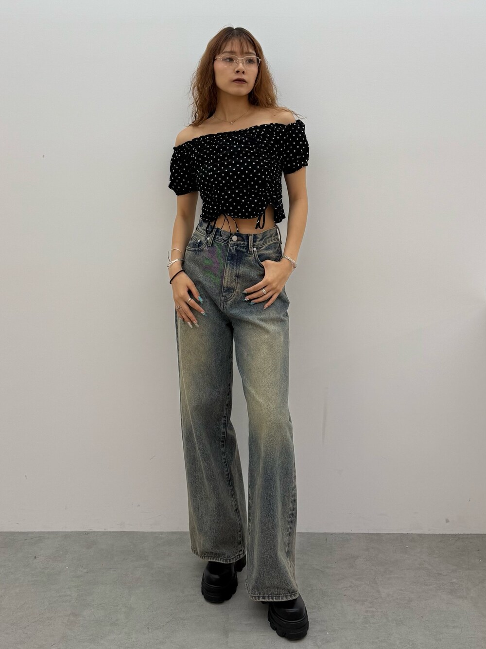~トップス~ トレンドのドット柄がポイントのトップス オフショルダーにしなくても着られるので2wayで着用可能 サラサラとした生地感で着やすく、デコルテがスッキリ見えるので小顔効果も抜群です 〜デニム〜 168cmでSサイズ着用 丈が長めなので高身長さんにもオススメ シンプルなデザインですがヒップ部分のリボン刺繍がポイント ストレートめのシルエットで細見え効果も抜群 〜シューズ〜 毎年大人気のサイドゴアブーツ 25.5cmでLサイズ着用 傾斜が少なく歩きやすいのがポイント どんなコーデにも合わせやすい万能ブーツです インヒールが入っているので美脚効果も抜群 ヒールが高すぎないのが疲れにくくてオススメ