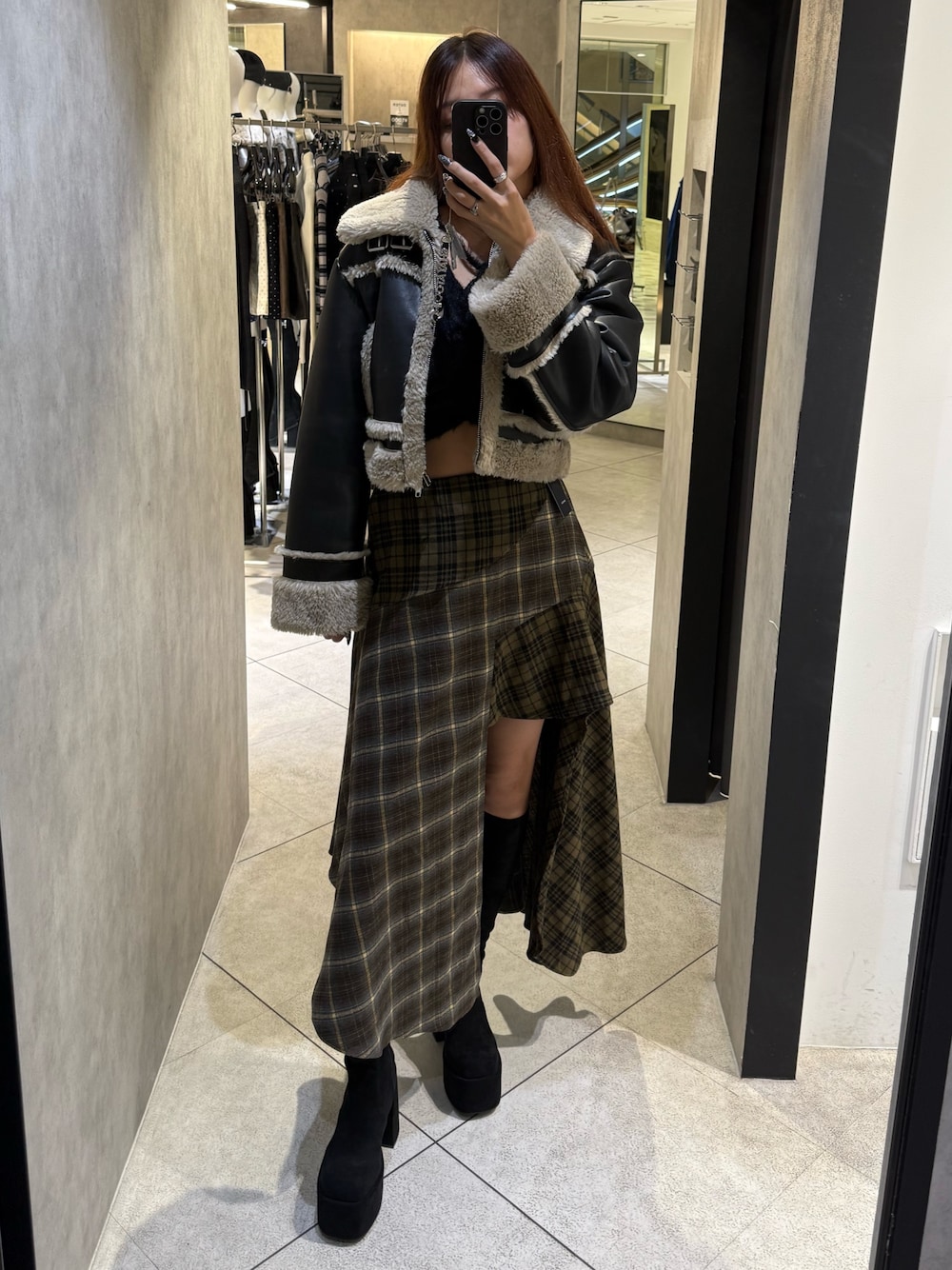 モードコーデ🖤 ~アウター〜 毎年人気のムートンブルゾンが今年も登場 コンパクトなサイズ感で丁度良いショートの丈感がスタイルアップ効果抜群 中までムートン素材が使用されているのと、スタンドネックにもできるので防寒性抜群 袖口が広めに作られているため中にたくさん着込むことができます どんなコーデにも合わせやすいオススメアウター ~トップス〜 前後2wayで着用可能 シャギー素材が冬らしくてリボンが今期らしいポイントのニット ショート丈でギャザーデザインのためウエストが細見えするのと、着膨れすることなく着られるのでオススメ ~スカート~ アシンメトリーデザインがポイントのマキシスカート トレンドのチェック柄を2種類使用していて、目を引きコーデのポイントになります スリットデザインが美脚効果も抜群 パンツとのレイヤードスタイルもオススメ ~ブーツ〜 毎年超人気の膝下-5キロブーツ 25.5cmでLサイズ着用 伸縮性と安定感が抜群で履きやすい どんなコーデにも合わせやすく万能 テーマパークでも一日中疲れずに歩ける優秀アイテム