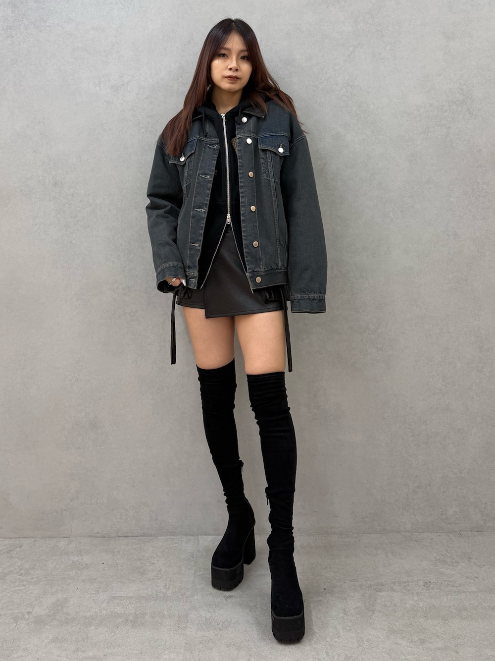 ~ブルゾン~ カジュアルな印象のデニムブルゾンですが、襟がレザーになっているのがモードな印象になりポイント 裏地のキルティングは取り外し可能なので、長い期間着用することができます 168cmでヒップ3分の2が隠れる丈感 ~インナー~ ダブルジップ仕様のオーバーサイズのフーディー 168cmでヒップ3分の2が隠れる丈感 トレンドのチェックロゴやパッチデザインがポイント ~ボトムス〜 前回大人気だったカーゴショートパンツがNEWカラーで登場 168cmでSサイズ着用 高身長さんは丈でMサイズがオススメ ウエストが細めの方や丈が短いのが好きな方はSサイズでも着用できます トレンドのアウトポケットとカーゴデザインがポイントで可愛い 骨ストさん優勝シルエットでウエストも脚も細見え間違いなし 〜ブーツ〜 25.5cmでLサイズ着用 EMODAで毎年1番人気の定番ニーハイブーツ 伸縮性抜群で履きやすく、丈調節も可能!! 傾斜が少なく、安定感抜群で疲れにくい とにかく爆盛れで履くだけで-5kg見え!!