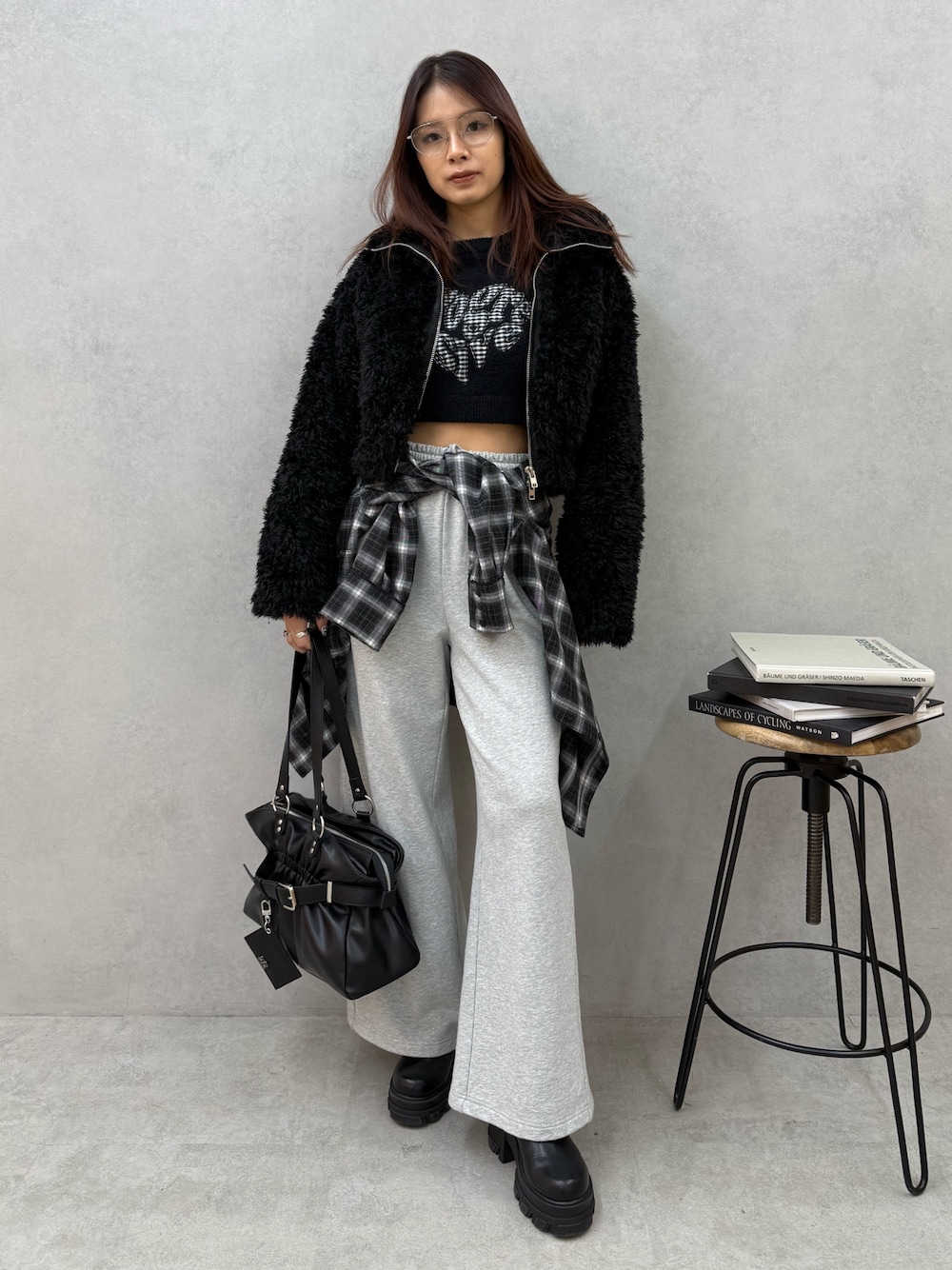 〜アウター〜 昨年も大人気だったボアブルゾン 袖口が広めに作られているため、中にたくさん着込めます ショート丈でコンパクトなサイズ感のため、着膨れすることなく着られるのもポイント スタンドカラーになるのと、袖口はリブになっているので防寒性も抜群 ダブルジップ仕様なのが今期らしい1枚 ~トップス〜 トレンドのチェックをハート型に落とし込んだアイキャッチになるシャギーニット シャギー素材で肌触りが良く、モチモチとした生地感で着やすい タイトすぎないサイズ感で、ショート丈のコンパクトにまとまるシルエットがポイント ~シャツ~ 着回し抜群のオーバーサイズシャツ ・ウエストや肩に巻いてプラスワンアイテムとして ・トップスとして1枚で着用 ・アウターのインナーとして ・トップスの中にレイヤードスタイルとして 様々な着方ができる万能アイテムです トレンドの細かなレースがポイント ~スウェットパンツ~ オールシーズン履けて着回しも抜群なスウェットパンツ スプレーアートのようなリボンモチーフがポイント ワイドシルエットですが、太すぎないシルエットで着痩せするのがオススメ ~シューズ〜 毎年大人気のサイドゴアブーツ 25.5cmでLサイズ着用 傾斜が少なく歩きやすいのがポイント どんなコーデにも合わせやすい万能ブーツです インヒールが入っているので美脚効果も抜群 ヒールが高すぎないのが疲れにくくてオススメ