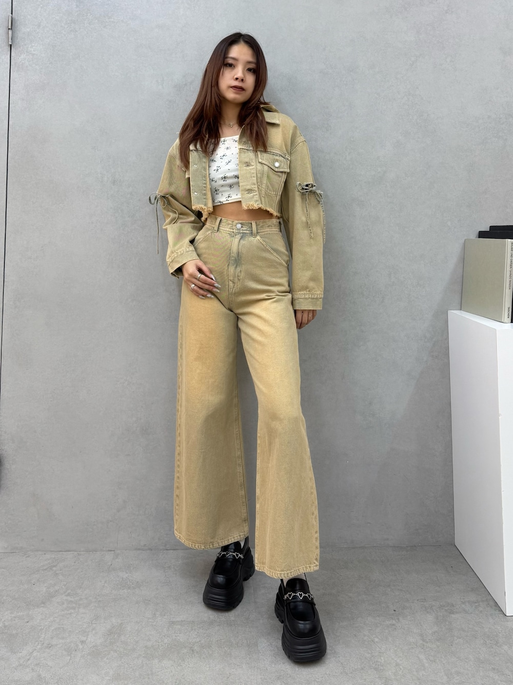 着用しているデニムとカーゴラップショートパンツのミニコーデと2タイプで選べるセットアップ ~ブルゾン~ デザインが特徴的で存在感のあるデニムブルゾン フードは取り外し可能 袖のカットデザインにリボンディテールがポイント 袖口が広めに作られているため、ゆとりがあり着やすく、中にたくさん着込むこともできます ~インナー~ 大人気だったベロア素材のトップスが春カラーで登場 シンプルなデザインで着回し抜群 ベロア素材が上品な印象に スクエアネックでデコルテを綺麗に見せてくれます ~デニム~ 168cmでSサイズ着用 高身長さんは丈でMサイズがオススメ シンプルなのでセットアップ以外もデニム単体として使いやすく、着回し抜群 ストレートめのシルエットが美脚効果抜群 ~シューズ~ 25.5cmでLサイズ着用 ハートチェーンデザインがポイント とにかく軽くて疲れにくいのがオススメ 傾斜もなく安定感も抜群 オールシーズン使える万能ローファー