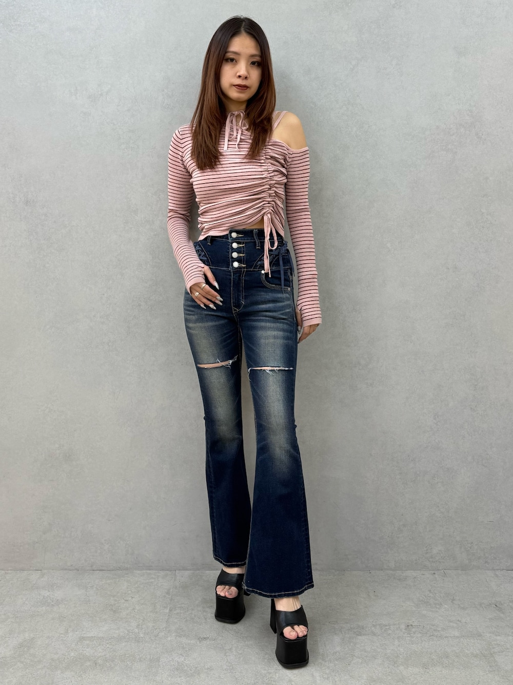~トップス~ 1枚で目を引くデザイン性抜群トップス さり気ない肌見せが女性らしさをアップしてくれます ギャザーデザインでウエスト細見え効果と丈調節も可能です 伸縮性抜群で着やすいのと、カラバリが豊富なのがポイント 〜デニム〜 ウエストのカーブレースアップデザインがポイント 伸縮性抜群で履きやすい ハイウエストなので脚長効果抜群 高めに付いたダメージとハイライト加工で美脚効果も抜群です 〜サンダル〜 25.5cmでLサイズ着用 シンプルなので使い回し抜群のEMODA定番厚底サンダル 傾斜が少ないので疲れにくく歩きやすい ソールが太めで安定感があります