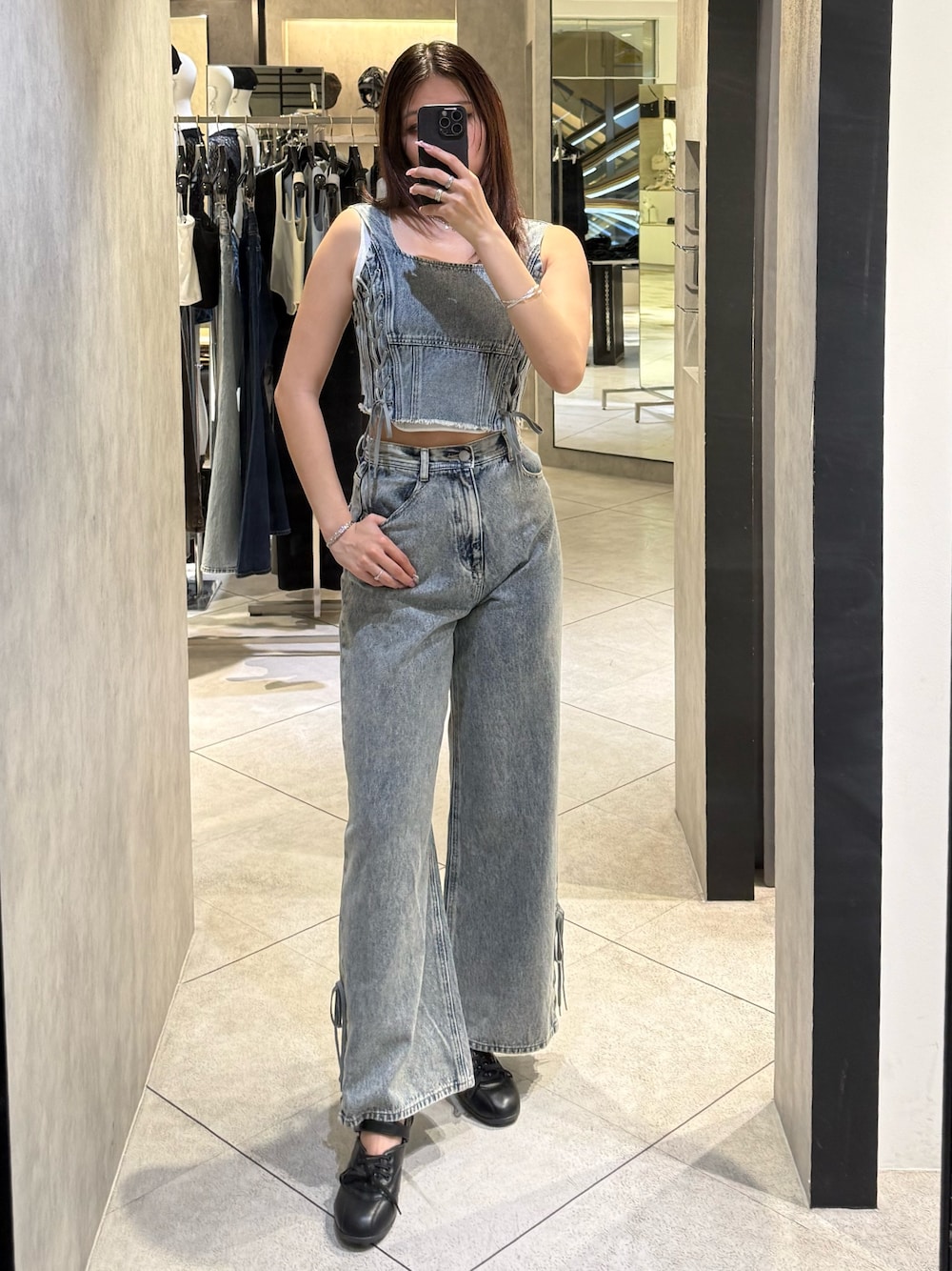 ~トップス~ ヘムレースアップルーズジーンズ・ベルトレイヤードボクシースカートとセットアップ着用可能アイテム レースアップデザインが今季らしくポイント インナーはタンクトップやキャミソールがオススメです 後ろがゴムになっていて伸縮性があるので着やすいです ~インナー〜 超万能タンクトップ 下着の紐が横からも前からも見えないので使いやすく、夏のインナー間題も解決 2色買いする方も多い、毎年大人気アイテム ウエストがブイカットになっていて細見え効果も抜群 胸元のEMODAロゴがポイント 〜デニム〜 168cmでMサイズ着用 高身長さんは丈でMサイズがオススメ サイドレースアップデニムビスチェとセットアップ着用可能アイテム シンプルなので着回しも抜群 サイドのレースアップデザインがポイント ~シューズ〜 デザイン性に優れており、コーデの主役になるヒールパンプス 25.5cmでLサイズ着用 ヒールが低めなので歩きやすく、疲れにくい パンツ合わせがイチオシです
