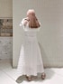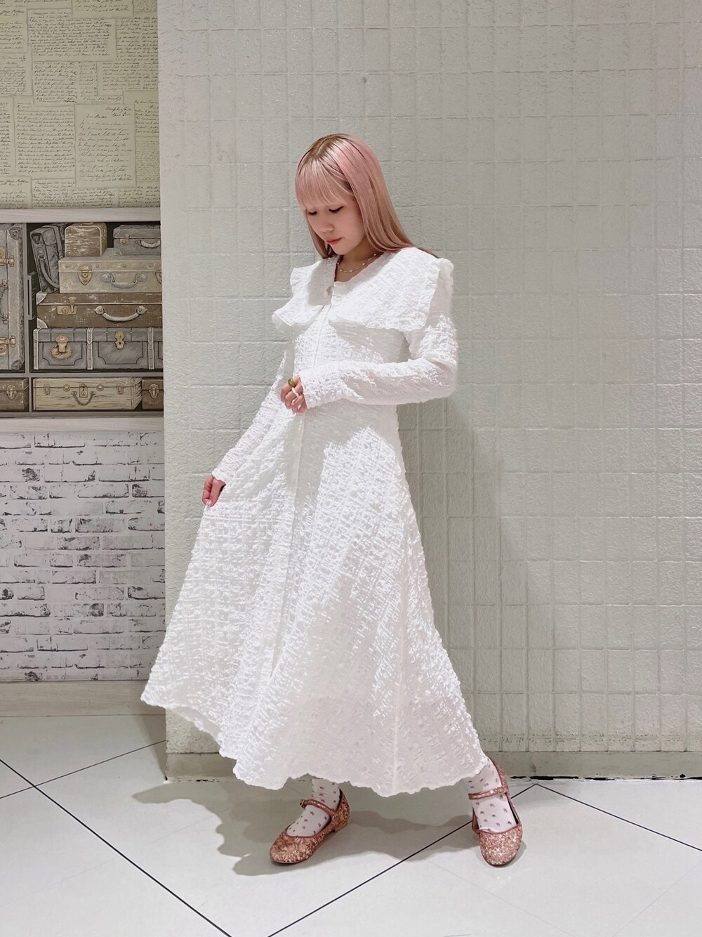 大人なWhiteコーデ 【ワンピース】くしゅくしゅした立体的な生地感で他にない雰囲気を出してくれるワンピース。すっきりしたVネックの首元はアクセサリーが映えます。大きなセーラー襟が印象的ですが、タイトめな上半身からふわっと広がるスカート部分でメリハリがついてすっきり大人っぽいシルエットです。【シューズ】きらきらのスパンコールシューズは軽量×フラットで歩きやすさ抜群!存在感がありながらもどんなお洋服とも合わせやすい一足。24.5cmでLサイズが丁度いいサイズ感でした。