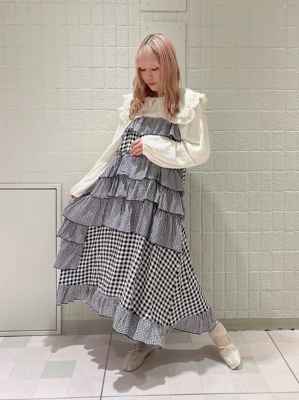 カジュアルガーリーコーデ【トップス】柔らかく伸びの良い素材のtopsは大きな襟がガーリーな印象。立体的な生地感でお手入れもらくちん。トレーナーやOPの中にレイヤードするのも◎【ワンピース】肩紐で長さを調節できる万能ワンピース!落ち感のある生地で広がりすぎないシルエットもpointです。インナー次第で様々な表情を楽しめます。【シューズ】レースアップがとびきりgirlyなバレエシューズ。ソールに高さもなく、フェイクレザーが柔らかいのでとても歩きやすいです。甘すぎないスクエアトゥでどんなお洋服とも合わせやすいデザインです。24.5cmでLサイズを着用しています。
