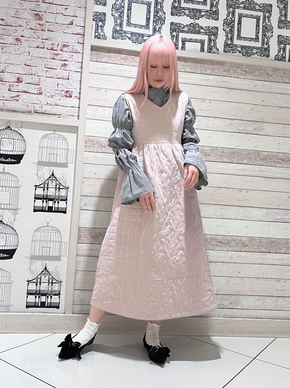 ピンク×グレー シックなワンピコーデ 【トップス】首元は少しハイネックで大人っぽく、袖にデザインがあるのでキャミOPなどをレイヤードしても華やかな印象に◎一気に上品でシックなコーデに仕上がります。 【ワンピース】オリジナルデザインのチューリップキルトが唯一無二のワンピース!高めの位置からふわっとスカート部分が広がるので体型カバーができます◎インナーをすっきりしたアイテムにすると大人っぽく、襟付きのブラウスなどを重ねるとガーリーにスタイリングできます! 【シューズ】上品なベロアで秋冬のコーデにぴったりのシューズ。履き口がゴム仕様でソールもフラットなので長時間履いても歩きにくい優れもの。大人っぽいデザインに、甘めのリボンがたまらない一足です。