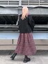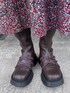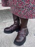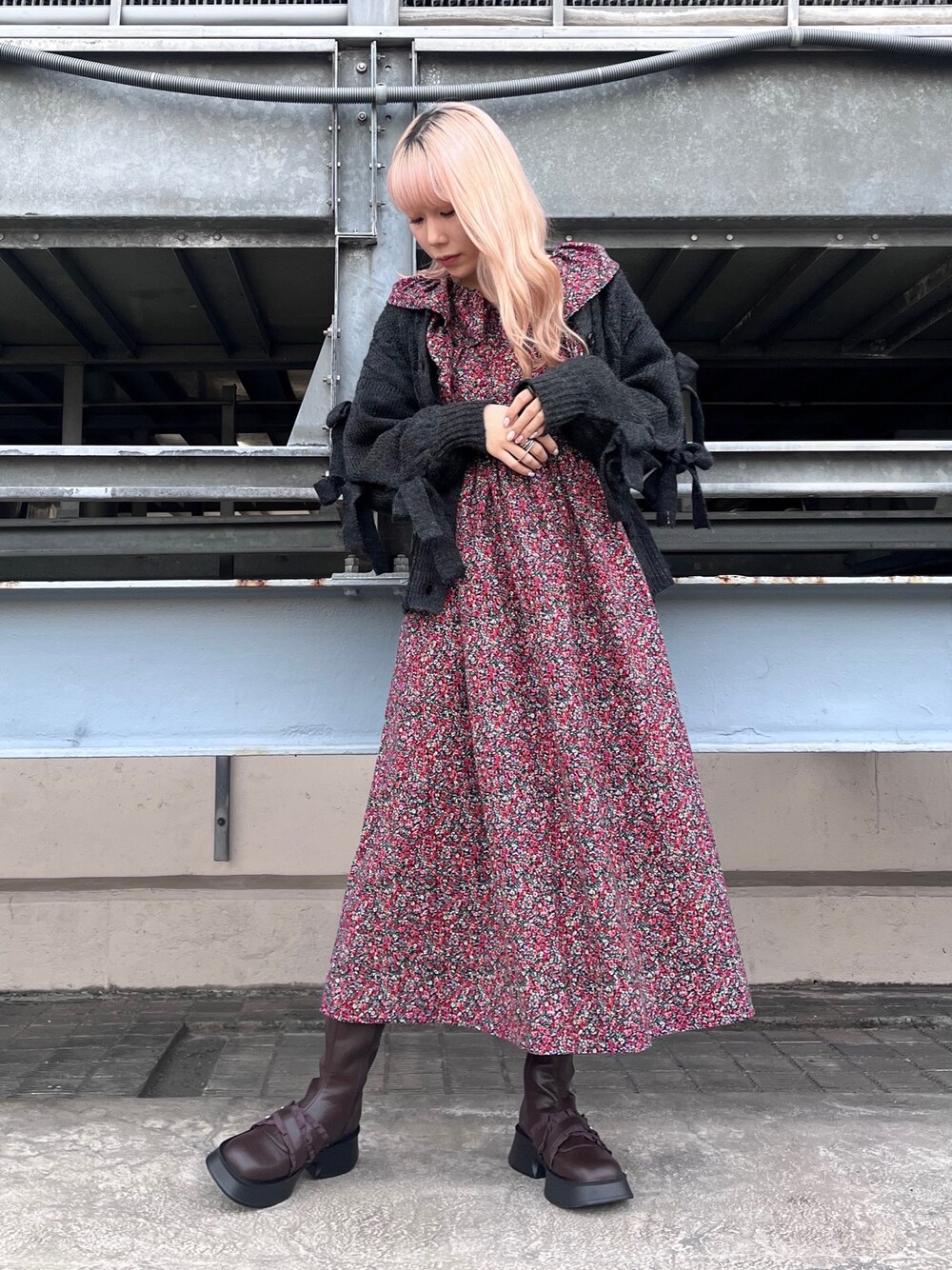 秋冬の大人かわいい花柄コーデ 【ワンピース】ルーズなシルエットの花柄ワンピースは首元がすっきりしているので、中にタートルを着込んでも◎2枚のフリル襟は主張が激しすぎず、大人っぽく冬のコーデに華やかさをプラスできます。 【カーディガン】袖のリボンが特徴的!しっかり暖かいニット素材で可愛く防寒できます◎袖のカットアウト部分から柄物のトップスを覗かせてもお洒落。秋冬の主役カーディガンです! 【シューズ】細身のロングブーツはごつさが少なく、ガーリーなお洋服とも相性抜群◎フリルベルトやハートのスタッズでさらに可愛らしさをプラス!ミニ丈のボトムはもちろん、ロングスカートを履いた時にも可愛いポイントが見えるのが◎