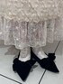 キラキラ大人のキャミワンピコーデ 【トップス】襟の刺繍が珍しく目を引くブラウス。トレーナーやカーディガンに重ね着して襟だけ見せても◎1枚で主役級ブラウスです。 【ワンピース】裾のキラキラが唯一無理のキャミワンピース。光沢のある上品な生地でオケージョン用にも◎中に合わせるアイテム次第でがらっと雰囲気を変えられます! 【シューズ】上品なベロアで秋冬のコーデにぴったりのシューズ。履き口がゴム仕様でソールもフラットなので長時間履いても歩きやすい優れもの。大人っぽいデザインに、甘めのリボンがたまらない一足です。