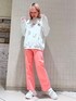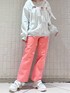 ピンクが目を引く!デニムコーデ 【インナー】 メッシュ素材が涼しげな、着心地の良いシアーなニット。冬は重ね着しやすく、春は1枚でも着やすい万能トップスです。 【トップス】 オーガンジーのリボンで繋がれた唯一無二のデザインで個性をプラス。着心地の良いスウェット素材で楽に、可愛らしく、着ていただけます。レイヤードもしやすい少しゆるっとしたサイズ感です。 【ボトムス】 ちいさなリボンが散りばめられたガーリーな印象のデニムパンツ。ストレートのシルエットはどんなトップスとも相性◎スウェットと合わせて楽ちんに、ブラウス合わせでガーリーに、様々な組み合わせで楽しめます! 【シューズ】歩きやすさと可愛さがMIXされた最強スニーカー!シアーなお花柄のデザインと散りばめられたリボンでより可愛らしく♡厚底ソールですが想像以上に軽いので長距離のおでかけにぴったりです!24.5cmでLサイズですが少し余裕があるようなサイズ感です!かかとでサイズ調節ができるのが安心ポイント◎