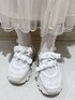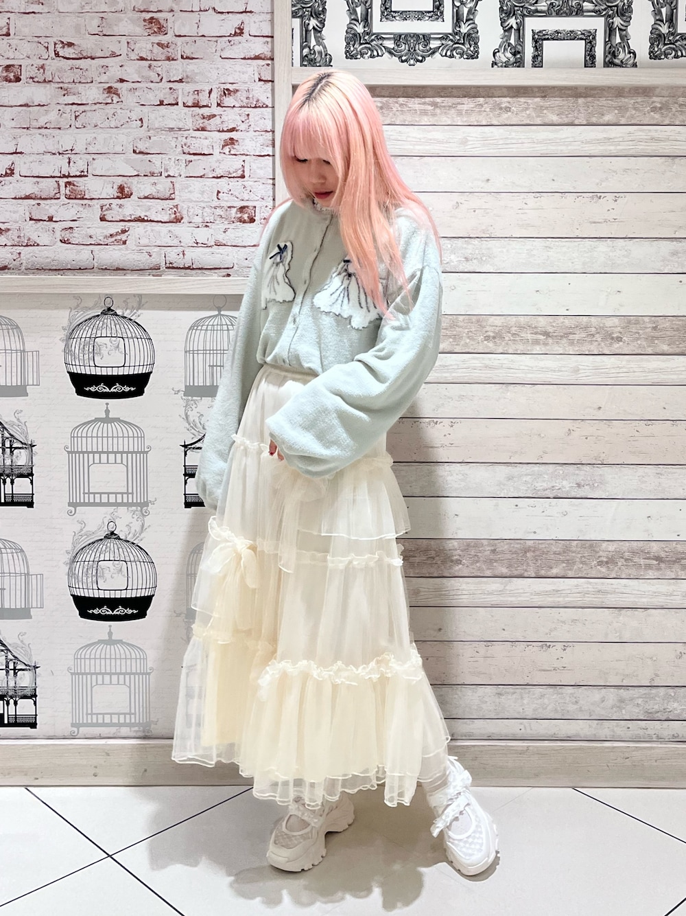 目を引くカーデでガーリーコーデ🤍 【トップス】 小花柄が上品でガーリーなトップスは伸びの良い生地でレイヤードしやすいアイテム。袖のリボンたちもアクセントに。1枚あると何かと使えるアイテムです。 【カーディガン】 ゆるっとしたシーズーが目を引くカーディガンはmerryjenny定番のシルエット。ふわふわ柔らかい生地感でボトムにインもしやすい!ボタンを閉めてトップスとして使うのも◎ 【ボトムス】 ふわっと可愛らしい印象になるチュールスカートにはさらにリボンをプラス。甘めな雰囲気ですが、あまり広がりすぎないシルエットなので普段使いもしやすいです。ウエストも総ゴムで窮屈感なく、楽に履いていただけます! 【シューズ】 カジュアルなスニーカーテイストにリボンやチュール、透け感をプラスして唯一無二の可愛さのあるシューズに。圧倒的に軽く、脱ぎ履きも楽なアイテム。靴下の色や柄がよく見えるので様々な雰囲気を楽しめます♪