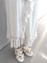 【トップス】 小花柄とセーラー襟がドッキング!ガーリー要素たっぷりの万能トップス。さらっとした柔らかい生地でお洗濯も楽チン。夏に大活躍しそうなアイテムです。 【ワンピース】 落ち感のあるシルエットのワンピースにリメイクされたようにフリルがつきました。古着感のあるデザインでトップス次第でさまざまな雰囲気を楽しめます。 【シューズ】 リボンがふんだんに使われたサンダル。形はカジュアルな雰囲気ですが、サテンのリボンでガーリーデザインに。高さも低めでフラットなので歩きやすさ◎かかとの部分でサイズ調節ができるのも嬉しいポイント!