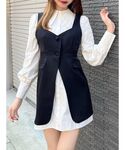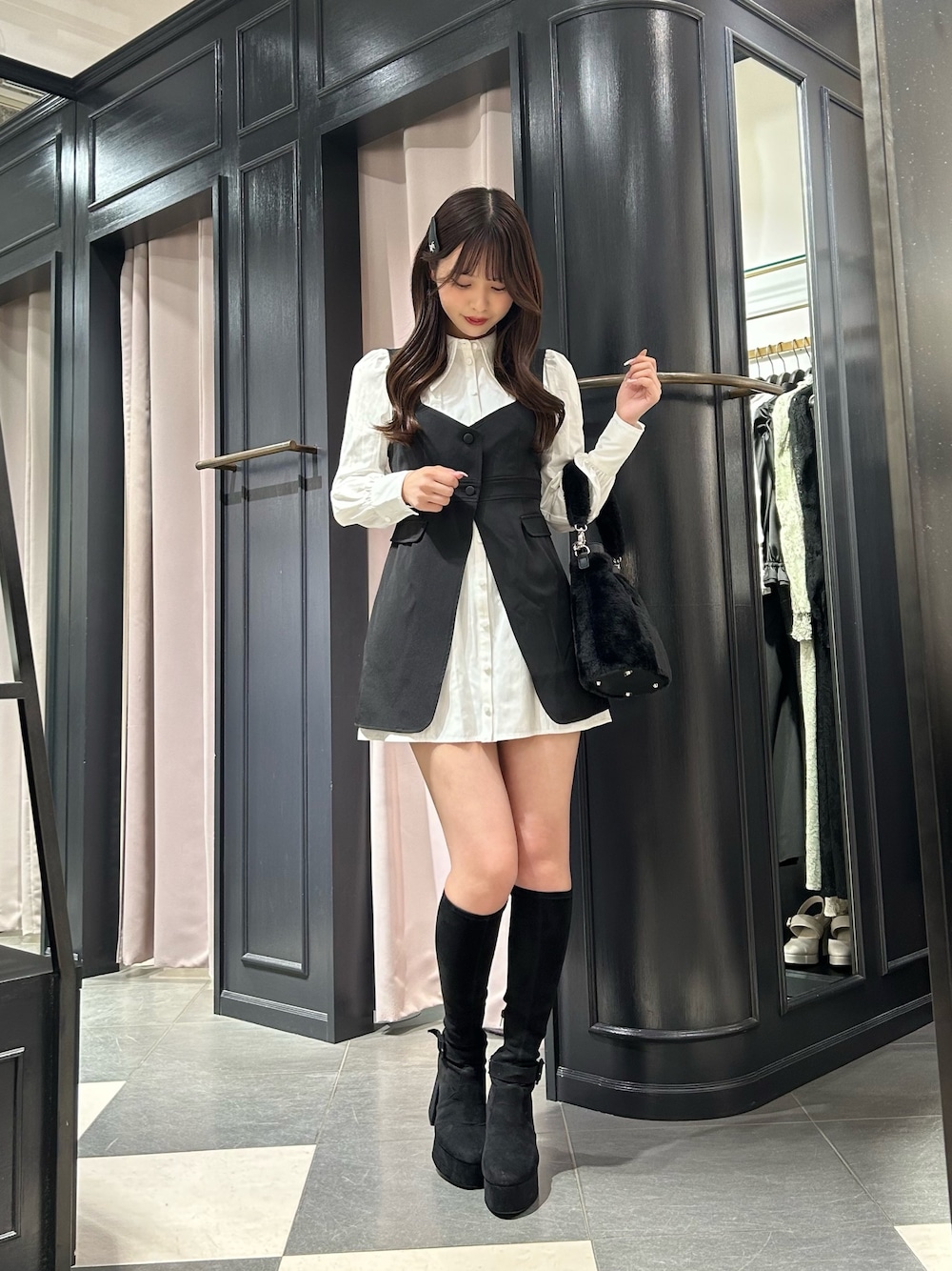 モノトーンコーデ🤍🖤 黒のベストがセットになったシャツワンピースは2WAYで着れる優秀アイテム👏🏻 ファーバックをもってトレンド感🆙