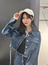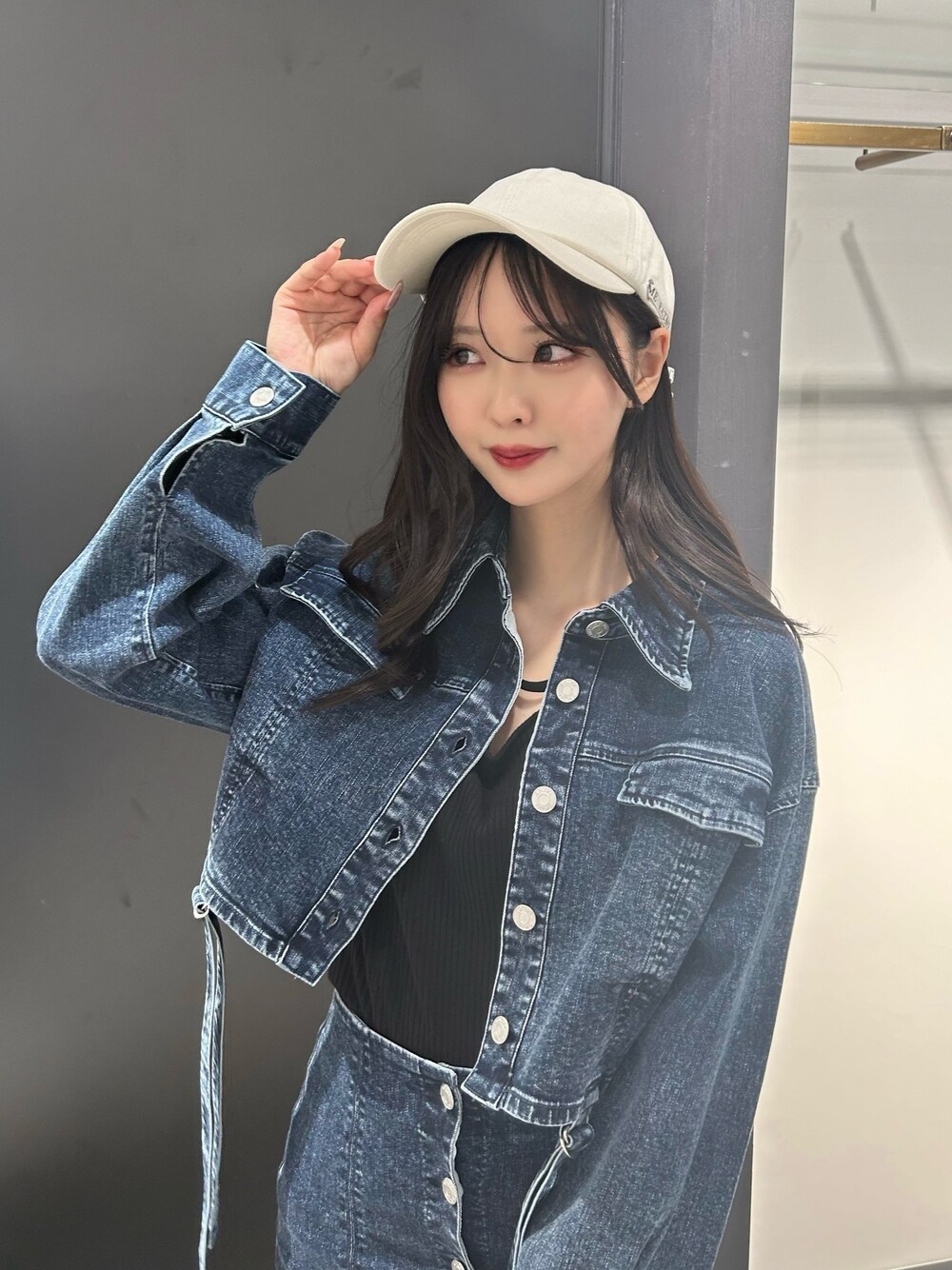 トレンドのデニムセットアップ💙 お気に入りのロゴリボンキャップに合わせたかったんです❤︎ 深すぎない形で前髪も崩れにくかった🥺 セットアップアイテムは以前の投稿で、アイボリーカラー着てるのでそちらもチェックしてみてね︎︎︎︎☑︎
