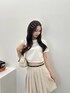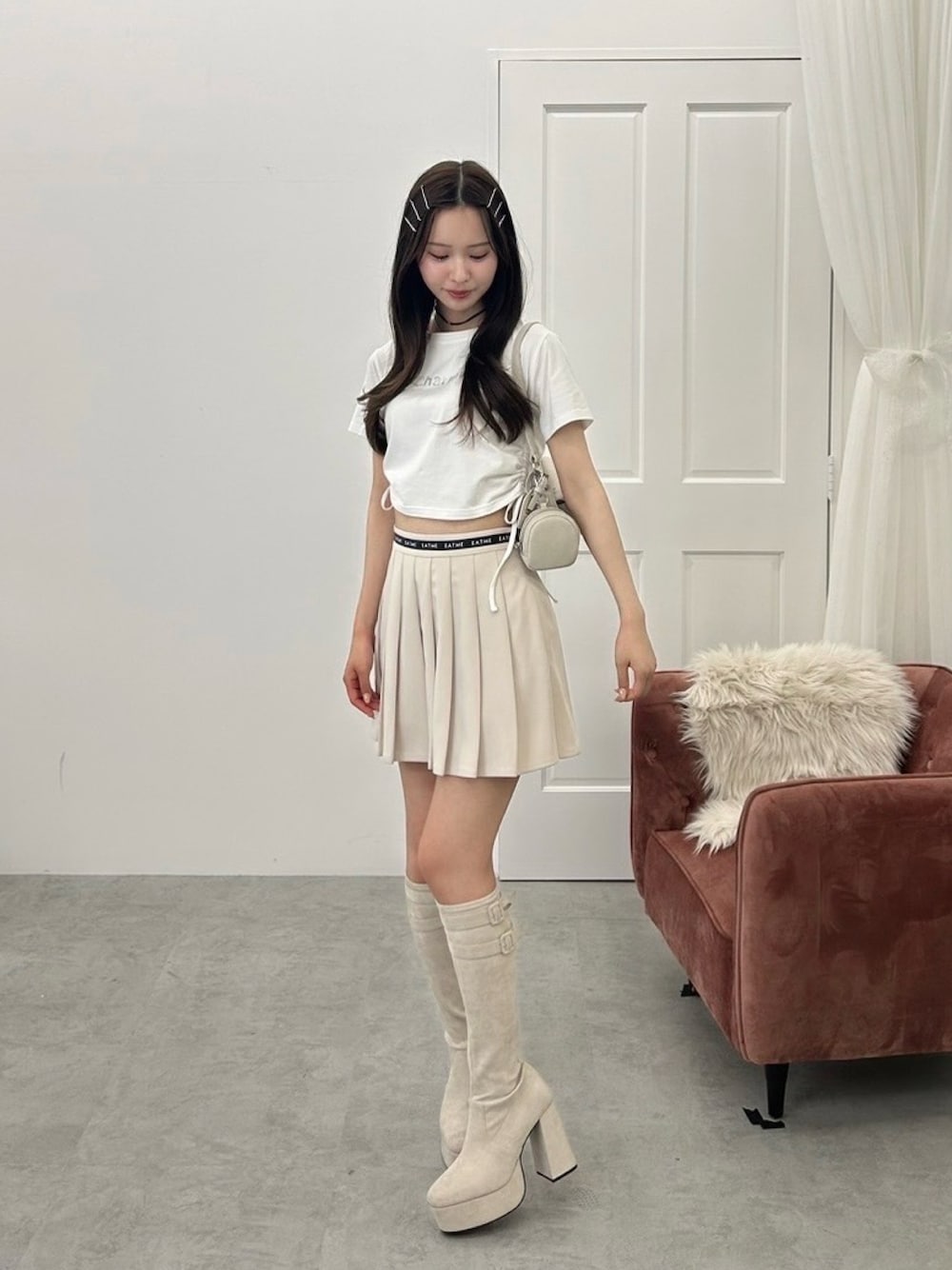 カジュアルガーリーコーデ🎀 ビジューロゴとサイドのギャザーリボンが可愛いTシャツ🥺🌟 チビTだけどガーリーな雰囲気になるからオススメ👏🏻 スカートはウエストロゴとプリーツがスポーティーさがでてカジュアルなスタイルに仕上がるよ〜🙆🏻♀️