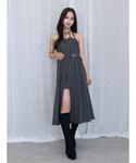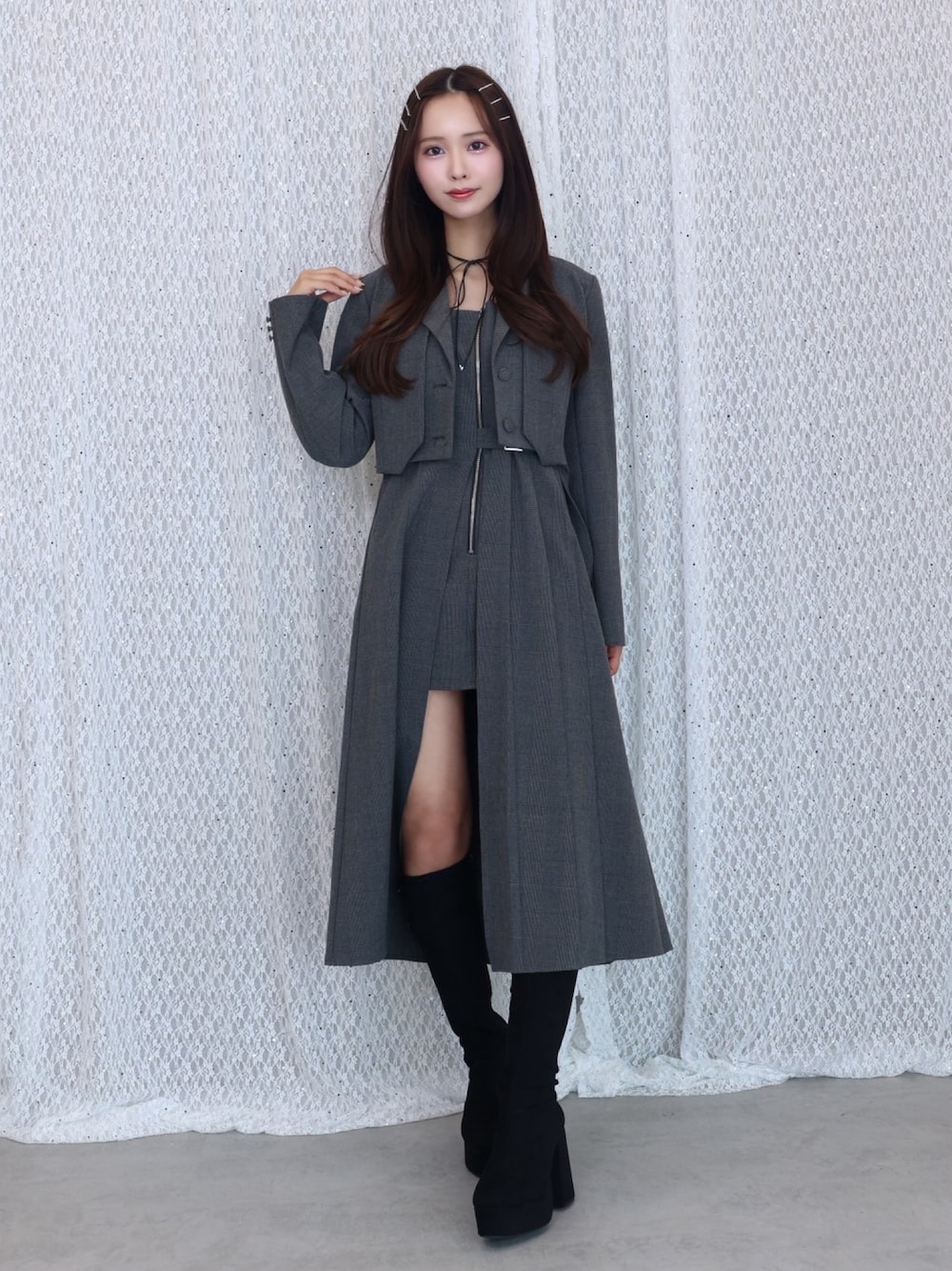 モードなスタイリッシュコーデ🩶🎧 【ジャケット】 袖が取り外し可能なジャケット♡オールシーズン着まわせる優秀アイテムです◎クロップド丈のジャケットで羽織るだけでスタイルアップ効果抜群です!パネルラインも入ってるから自然と細見えを叶えてくれます🌟 【ワンピース】 ラップ風デザインでミニ丈ワンピースにロングスカートが巻いてるような1着のワンピースです🫶🏻トレンド感あるホルターネックと、アシンメトリーのスカートが可愛い❤︎首元の紐はアジャスター付きで長さ調節出来るのも嬉しい♡♡ 【シューズ】 昨年も大人気だったロングブーツ♡♡今年は膝下にベルトデザインがくるようになっててさらに細見えを叶えてくれます🌟ストレッチの効いた素材なので柔らかくて着脱も楽ちんです🙆🏻♀️