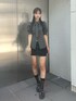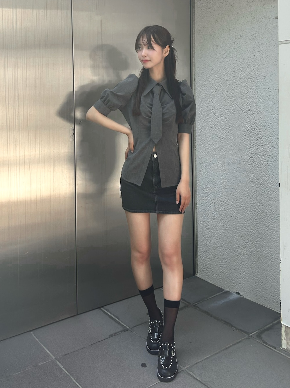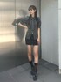 【トップス】 トレンドなネクタイ付きのブラウス!袖のパフと胸元のギャザーが可愛い♡♡ウエストはくびれができるようなシルエットで着るだけで細見え抜群です◎ 【スカート】 360°可愛いミニスカート!タイトシルエットで骨盤周りもスッキリ細見えを叶えてくれます♡♡太ももがしっかり出る丈感になるのでインナーパンツを履くのがオススメです◎ 【シューズ】 ストーンが沢山詰まった可愛いローファーシューズ✨足元に目がいく華やかな1足です!ヒールは7.5センチでスタイルアップ効果も◎安定感のある履き心地抜群のアイテムです!23.5cmの足でLサイズ着用しています!