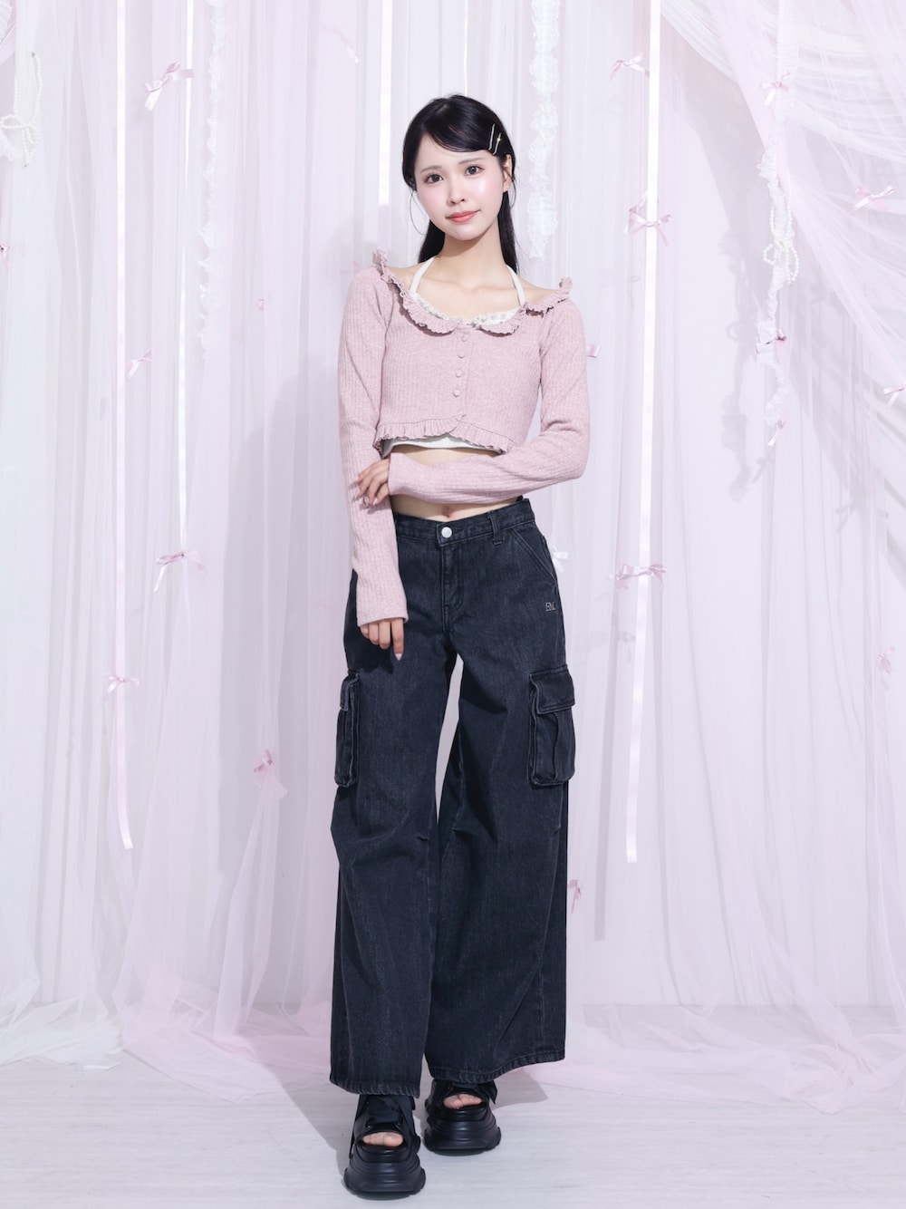 カジュアルライクコーデ♡♡ 【トップス】 ラメ感のニットが可愛いトップス🫶🏻ホルターネックのトップスと、カーディガンがセットになっているので別々の使用も可能◎ビジューリボンのモチーフとフリルがかわいくてお気に入り♡♡ 【ボトムス】 ワイドなシルエットでダボッと感が可愛いパンツ♡ウエストゴムのデザインや、後ろにはカットアウトデザインで肌見せがあり抜け感もでます!ローウエストだからショート丈のトップスを合わせてスタイルアップするのがオススメコーデ♡♡