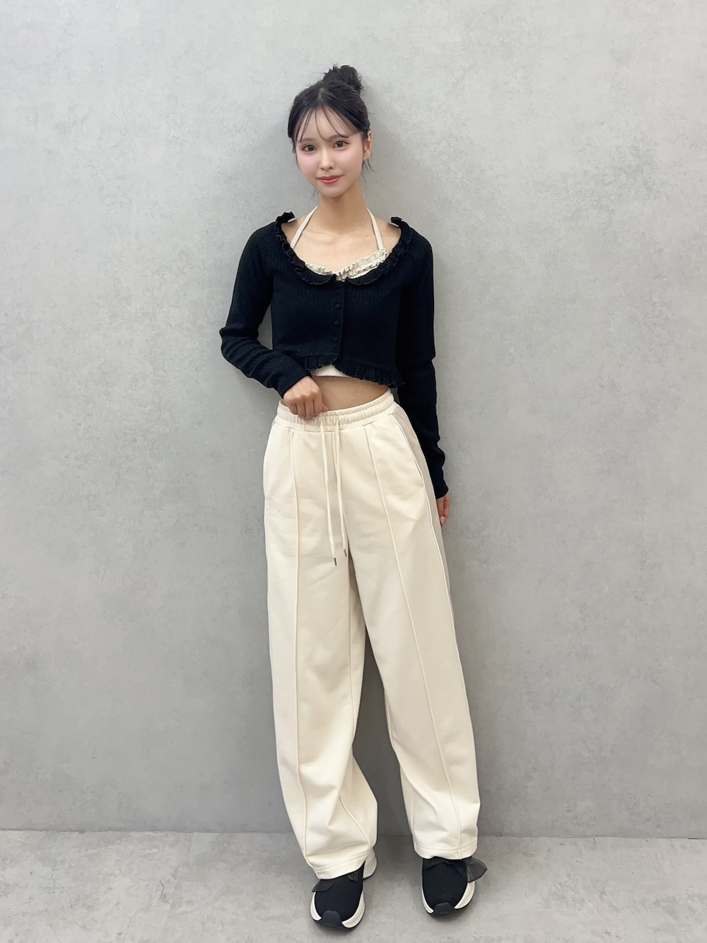 楽ちんなカジュアルコーデ♡ 【トップス】 ラメ感のニットが可愛いトップス🫶🏻ホルターネックのトップスと、カーディガンがセットになっているので別々の使用も可能◎ビジューリボンのモチーフとフリルがかわいくてお気に入り♡♡ 【ボトムス】 サイドにバイカラーのラインが入ったスウェットパンツ♡ウエストゴムで紐で調節も可能◎ストレスフリーな着心地抜群のアイテムです! 【シューズ】 大人気のスニーカーブーツ♡♡とにかく履き心地抜群で疲れにくいアイテム!ニット素材になっていて窮屈さもないです◎リボンはチュールになっていて春っぽさがかわいい♡