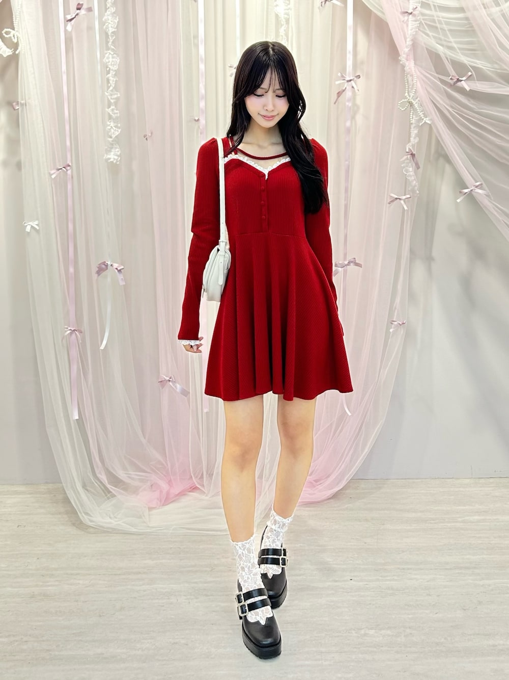 【ワンピース】 柔らかいリブニット生地で着心地良いワンピース♡♡フィットアンドフレアのシルエットで体型カバーも◎ 【シューズ】 ダブルベルトデザインが目を引くシューズ🫶🏻安定感ある太めのヒールで歩きやすいです♡♡