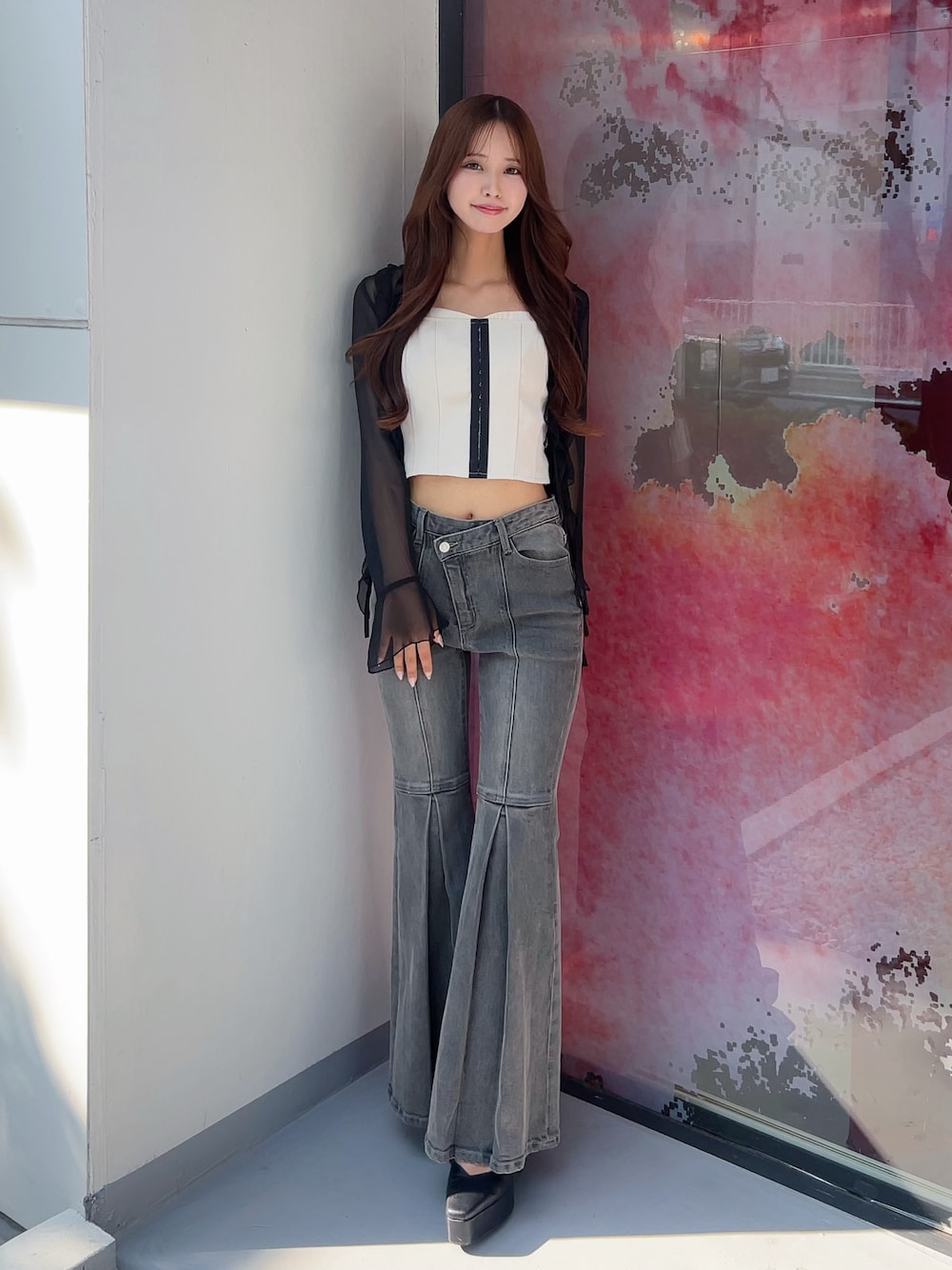 美脚デニムコーデ♡ 膝上から切り替えがあって足の細見え効果も抜群🥺✨ キャミソールとカーディガンの組み合わせて 大人カジュアルなスタイルです💭