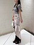 【トップス】 デコルテのハートのビジューチャームが目をひくトップス♡ ホルターネックのキャミはバスト周りのギャザーデザインとフリルで女性らしい華やかな可愛いさ♡ 伸縮性があって着心地いいアイテムです 【スカート】 大きい2段のフリルがかわいいデニムスカート 前開きスリットで美脚効果も◎ カジュアルすぎずガーリーなスタイリングが出来ます♡ 【シューズ】 安定感抜群のブーツサンダル 高いヒールでも太めのデザインだから歩きやすいです◎