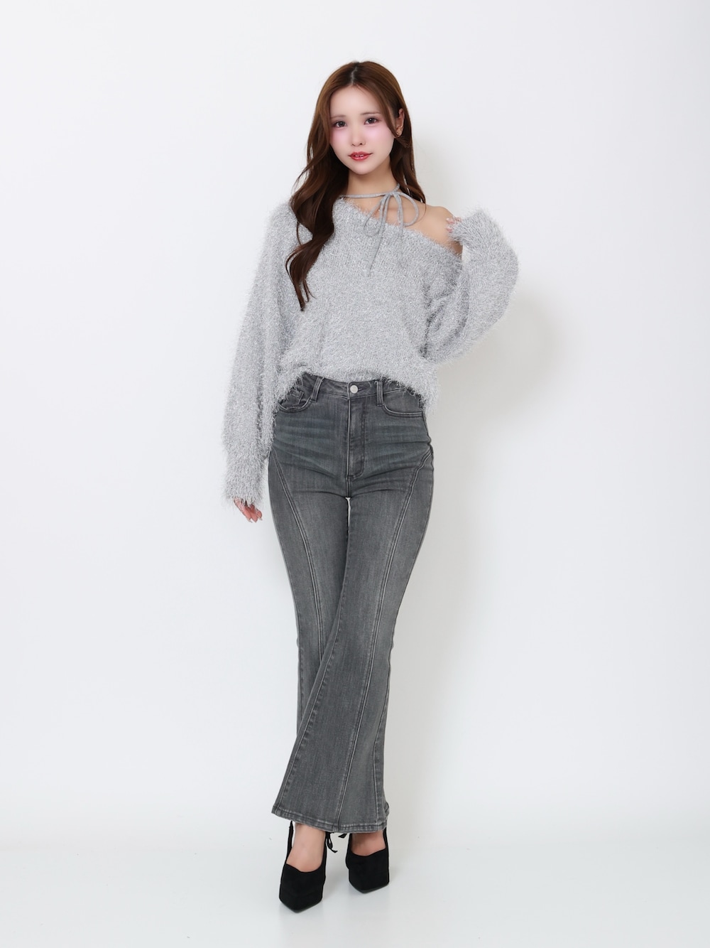 【トップス】 ラメ糸のキラキラ感が可愛すぎるワンショルニット。首元のリボンは取り外しも可能◎好きなリボンの付け方が出来ます! 袖のボリューム感やワンショルダーの肌見せが女の子っぽさをアップしてくれます♡ 【ボトムス】 ストレッチ素材の柔らかいデニムパンツ♡ フレアシルエットで美脚見え!ガーリーにもカジュアルにも合わせやすいアイテムです