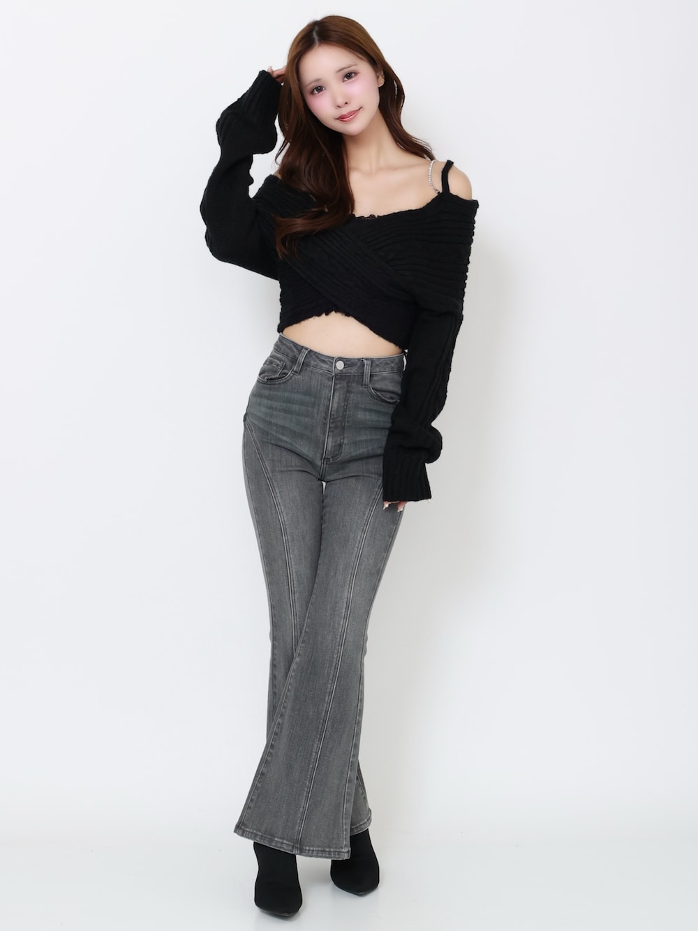 【トップス】 ケーブル編みが可愛いニットトップス♡ ビジューとバックリボンが女の子らしくてお気に入りのポイント 【ボトムス】 ストレッチ素材の柔らかいデニムパンツ♡ フレアシルエットで美脚見え!ガーリーにもカジュアルにも合わせやすいアイテムです 【シューズ】 ピタッとしたシルエットが可愛いニットブーツ 尖ったつま先デザインでキレイめな印象に ヒールも細めデザイン♡キレイめからカジュアルまで様々なコーデに合わせれます〇
