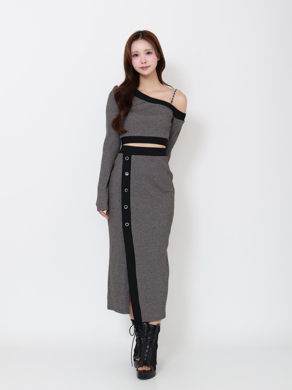 【トップス】 ワンショルデザインのリブトップス♡ ショルダー部分はチェーンデザイン!チェーンのキラっと感が可愛いです。 丈感は短く、ウエスト周りはバイカラーになってるので引き締め効果も抜群です。 【スカート】 フロントボタンデザインが目を引くタイトルスカート。スリットが入っていてチラッと足の肌見せがあるデザインです♡ 【シューズ】 メッシュデザインのブーツサンダル。レースアップリボンのデザインで、着脱は横のチャックの開閉で可能です!太めのヒールで安定感があり履きやすいアイテムです!
