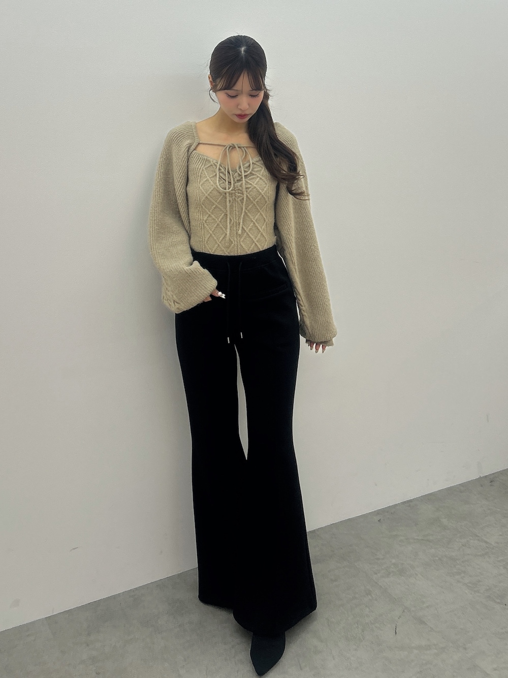 スウェットパンツの着回しコーデ♡ 【トップス】 キャミとボレロがセットになったニットトップス♡ケーブル編みが可愛いデザイン!もちもちしたニットで着心地も抜群です 【ボトムス】 ダンボール素材のスウェットパンツ フレアシルエットで美脚効果抜群です! 【シューズ】 ピタッとしたシルエットが可愛いニットブーツ 尖ったつま先デザインでキレイめな印象に ヒールも細めデザイン♡キレイめからカジュアルまで様々なコーデに合わせれます〇