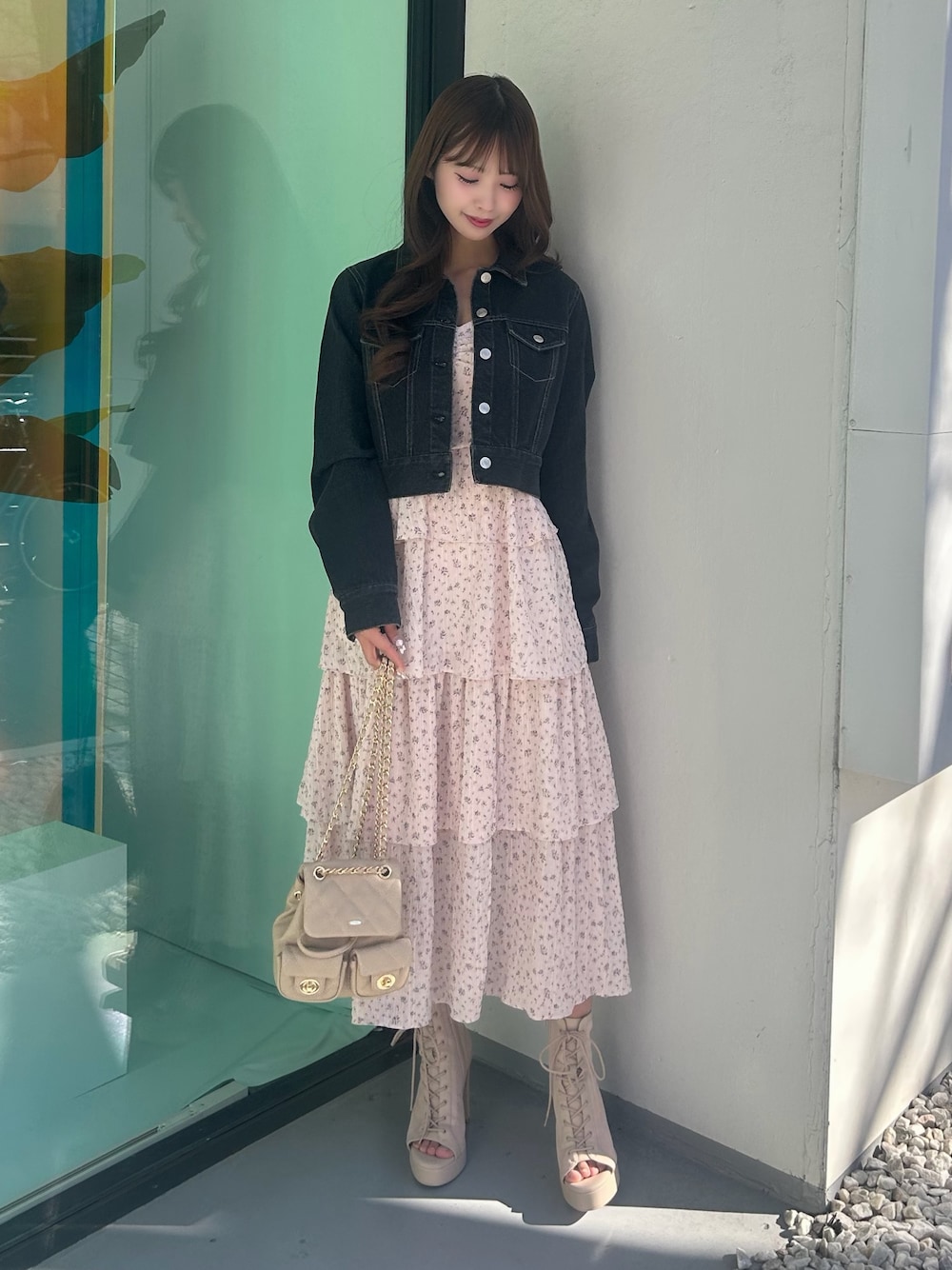カジュアルガーリーワンピース♡ 【ワンピース】 小花柄がガーリーで可愛いワンピース♡ ティアードデザインでフレアなシルエットが可愛い♡後ろでリボンをきゅっと結ぶとウエストにくびれも出来て嬉しい♡ パット入りで1着で着られます!カーディガンやデニムジャケット、など着回しも楽しめます! 【ジャケット】 着回し自由なジャケットアイテム♡ 後ろにはロゴ入りで可愛い♡ 【シューズ】 メッシュ素材の透ける春夏ぴったりなシアーサンダル♡♡ レースアップのデザインがアクセントになる可愛いアイテムです♡