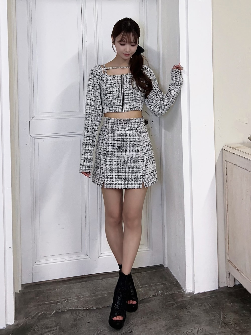 【トップス】 ツイード素材で上品なトップス セットアップのスカートと合わせると更に可愛いコーデに♡ デニム合わせでカジュアルフェミニンなコーデにも…♡着回し安いアイテムです 【スカート】 ツイード素材で華やかになる台形スカート ダブルスリット入りで足の細見え効果抜群です♡