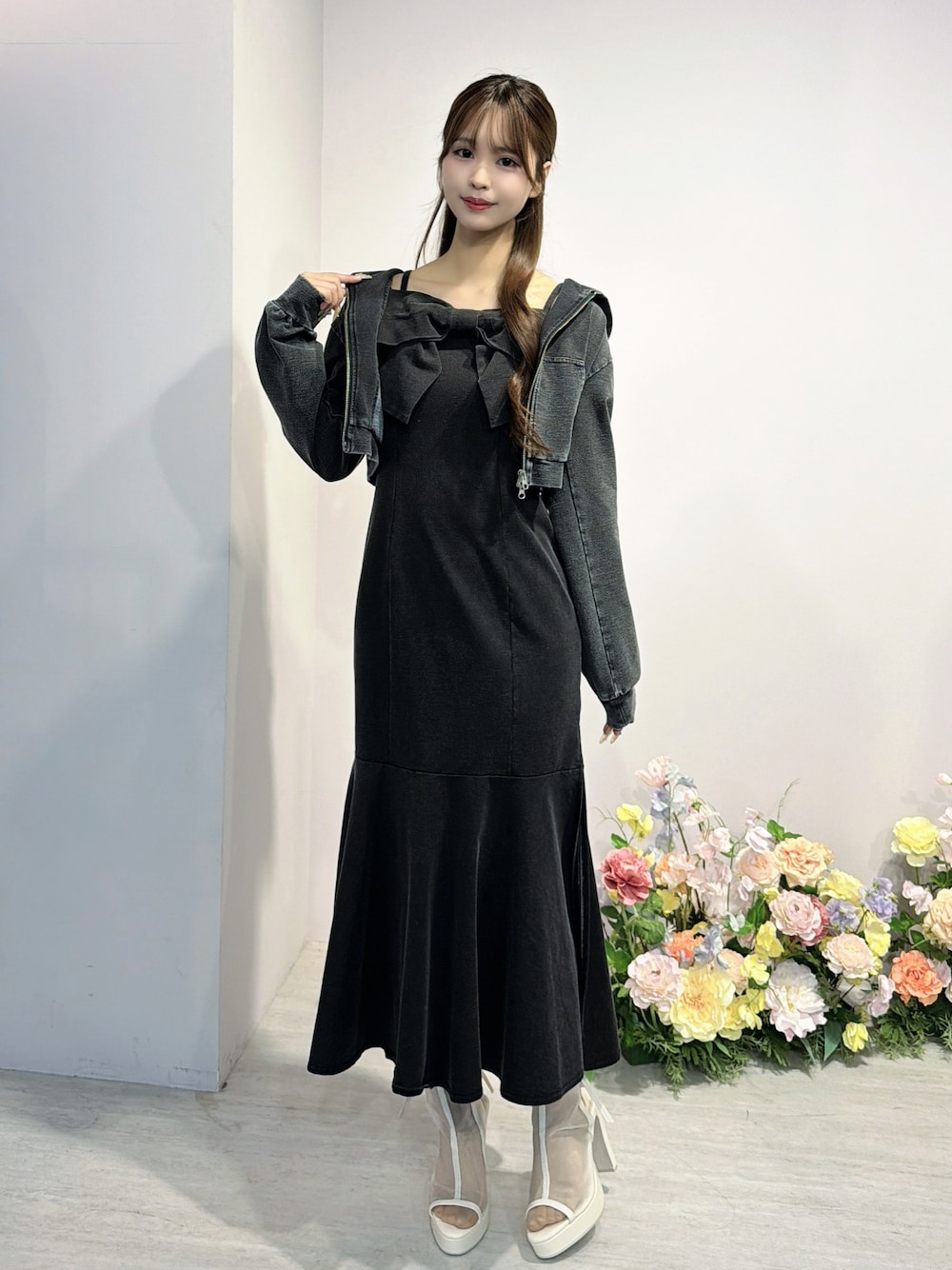 【パーカー】 裏毛のデニムパーカー♡サイドのロゴパッチも可愛い♡季節の変わり目にも使いまわせるアイテムです 【ワンピース】 胸元のリボンが映えるデニムライクワンピース♡ スウェット素材だから動きやすいです! 女性らしいシルエットをつくるマーメイドシルエットが可愛いです♡ 【シューズ】 バックリボンがついて可愛いシアーのブーツサンダル♡ヒールは太めなので安定感があって履きやすいです!