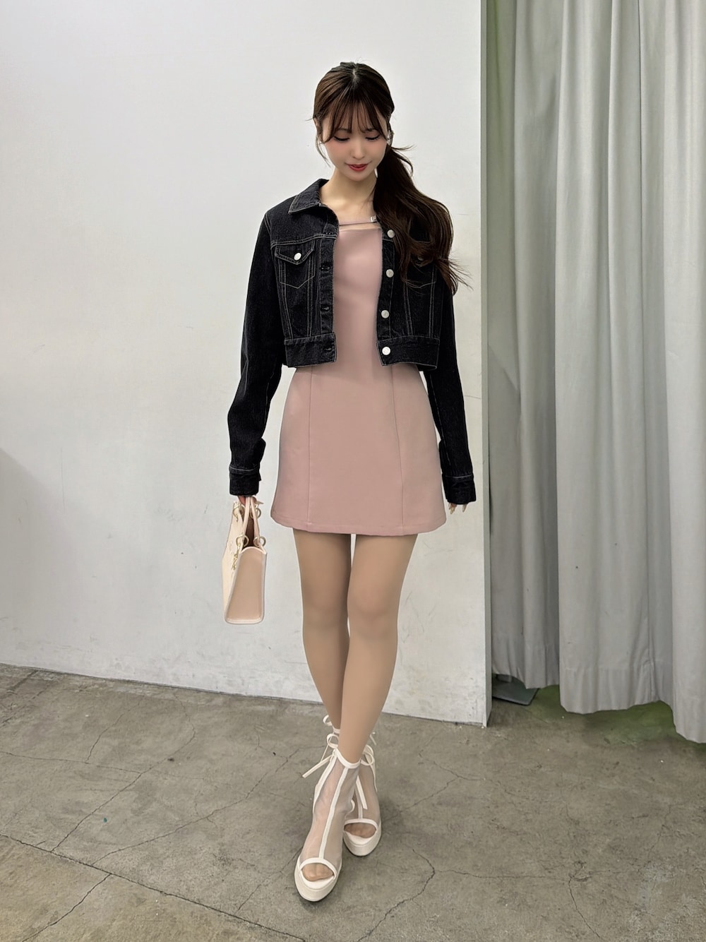 【ジャケット】 デニムジャケット♡ 短丈でスタイルアップが叶います! ワンピースに合わせるとガーリーな印象♡ 【ワンピース】 バックスタイルが可愛いレースアップワンピース♡♡ 前はシンプルなデザインですがパネルラインが入っていて細見えします♡ 【シューズ】 バックリボンがついて可愛いシアーのブーツサンダル♡ヒールは太めなので安定感があって履きやすいです!