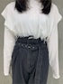 【トップス】腕の上部が開きすぎず、お顔もスッキリ見えるオーバーシルエットデザインで、ボトムスにインして着るのもオススメです◎ 【ボトムス】ワイドながらウエストがかなり絞られるので細見えします!154㎝で厚底シューズ合わせなら擦らずに履けます◎ 【シューズ】軽くて、前と後ろの高低差が無く10.5㎝ヒールなので程よく盛れます◎