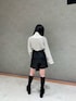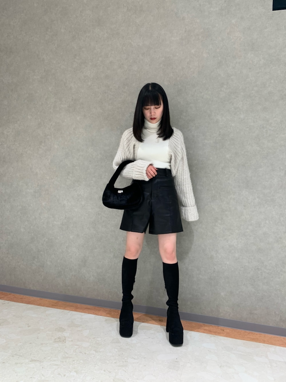 ○甘辛ミックスコーデ○ [トップス]シャギーボレロがドッキングしたデザインで、1枚でお洒落に着れるニットです。 [ボトムス]センターラインと、スリットが入っているので脚が長く見えます。広がりすぎないので細見えします! [シューズ] 前と後ろの高低差が少ない為、歩きやすく脚が長く見え綺麗めデザインのブーツです!