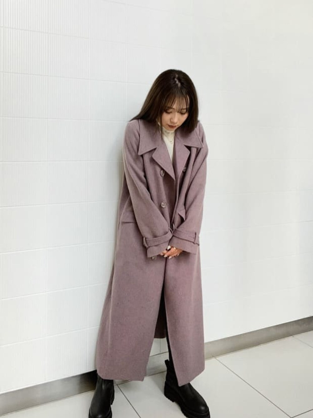 國岡朋実(MURUA)のチェスターコート「ダブルマキシチェスターコート」を使ったコーディネート