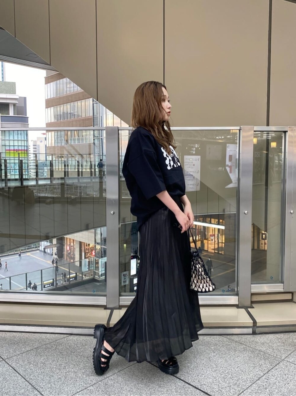 大人のブラックコーデ♡【tops】イラストレーターHiroki NishiyamaさんとのコラボTシャツ‼︎フロントには目を惹くプリントご施されている1着◎今回はシアープリーツスカートに合わせてMURUAらしいフェミニンモードに仕上げてみました!【 bottom】着回し力抜群の綺麗めプリーツスカート‼︎シアーデザインで春夏っぽい印象に◎光沢感のある素材なので歩くたびにキラキラと動きがでるので女性らしい印象に仕上げてくれます✴︎【shoes】トレンドのグルカサンダル!履くだけで足元から今年っぽい印象に仕上げてくれます✴︎見た目以上に軽量なので履き心地も良く、程よいヒールでスタイル UP効果抜群です‼︎【bag】夏らしい編み上げの巾着バッグ‼︎フェイクレザーを使用しておりお洒落度UP✴︎どんなスタイリングにも合わせやすいです◎