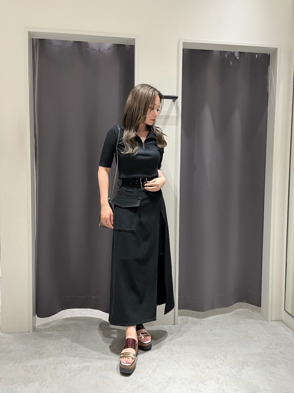 ☆ちらっと肌見せで夏でも着たくなるオールブラックコーデ☆【tops】イマドキのZIPデザインがおすすめポイント◎程よくタイトなデザインで女性らしいシルエットに仕上げてくれます!テレコ素材を使用しておりストレッチが効いて全体的に細見えしてくれます✴︎デコルテ周りもスッキリ見せてくれるのでオールブラックでも重たくならないです‼︎【bottom】MURUAで大人気のラップスカート!程よい肌見せで抜け感を出して女性らしいシルエットで着用できます✴︎ミニスカートや足を見せるのが苦手な方でも挑戦しやすいです◎(ミニスカートの丈感は156㌢Sサイズ着用で膝上5cm程です。)ワイドベルトでカジュアルダウンしてくれるのもオススメポイント!【shoes】毎年大人気!MURUA夏定番のクリアウェッジサンダル✴︎クリアデザインが夏らしさを足元から演出してくれます◎傾斜がほとんど無いので安定感抜群!どんなコーデにもマッチする優秀サンダルなのでこの夏大活躍すること間違いなしです‼︎(24.0㌢で横幅広め+足の甲高めな私で24.5㌢着用でピッタリです)【bag】フェイクレザーを使用したミニバッグ!ムラのあるデザインがポイント◎ショルダー/ハンドバックどちらでもお使い頂けます‼︎スネークチェーンがコーデのアクセントに✴︎