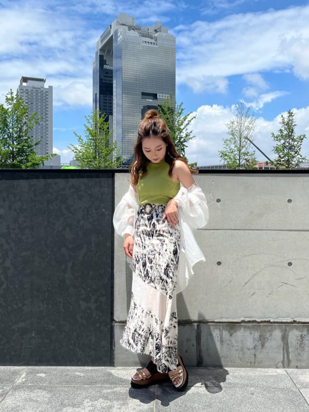 ☆この夏マストアイテムのアメスリコーデ☆【tops】今季トレンドのアメスリタンク!カップ付きなので1枚で楽ちんに着用できます◎1着でモードでヘルシーな印象に✴︎露出感が気になる方などはシャツなどと合わせるのがおすすめです♡【shirt】羽織るだけでお洒落なシアーシャツ!オーバーサイズでお尻まですっぽり隠れて体型カバーしてくれます◎光沢感のある素材なので透け感+上品な印象に‼︎素肌に触れても全くチクチクしないので着心地抜群です!トップスにカラーを合わせたかったのでシンプルにホワイトのシアーシャツで合わせました。【bottom】MURUAらしいデザインがポイントのスカート!シアーの切り替えがアクセントで程よい透け感で女性らしさUP◎歩くたびに揺れるシルエットが綺麗で可愛いです♡生地はサラッとしており薄手なので涼しく履きやすいです‼︎【shoes】毎年大人気!MURUA夏定番のクリアウェッジサンダル✴︎クリアデザインが夏らしさを足元から演出してくれます◎傾斜がほとんど無いので安定感抜群!どんなコーデにもマッチする優秀サンダルなのでこの夏大活躍すること間違いなし‼︎(24.0㌢横幅広め+足の甲高めな私で24.5㌢着用でピッタリです)