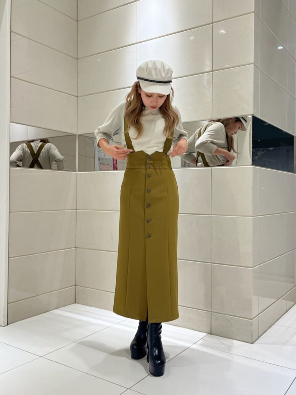☆秋カラーを使ったスタイルアップが叶う綺麗目コーデ☆【tops】MURUA定番、毎年人気のハーフスリーブニット!ベーシックなデザインなので着回ししやすく、どんなボトムスとも相性抜群◎少し薄手なので晩夏〜着ていただけます‼︎袖のリブや首周りも締まり過ぎていないので窮屈感もなく楽に着れます✴︎秋はライダースやトレンチコートで合わせるのがおすすめ‼︎【bottom】サスペンダー取り外し可能の2wayで使えるジャンパースカート!タイトなシルエットでIラインを強調させることで女性らしく美シルエットに見せてくれます◎サラッとした生地感なのでロングシーズン着用可能。今回はシンプルなハーフスリーブニットで綺麗目に秋らしいコーデにしました♡156cmでSサイズ着用してくるぶし上くらいです‼︎【shoes】トレンド厚底ブーツが今年も登場。ヒールがしっかりあるので足首周りを細く魅せてくれます!見た目以上に軽量なので長時間履いても疲れないです。普段24.0cmの私が37サイズ着用でぴったりでした◎【cap】チェーンがポイントのキャスケット✴︎コーデのアクセントに!