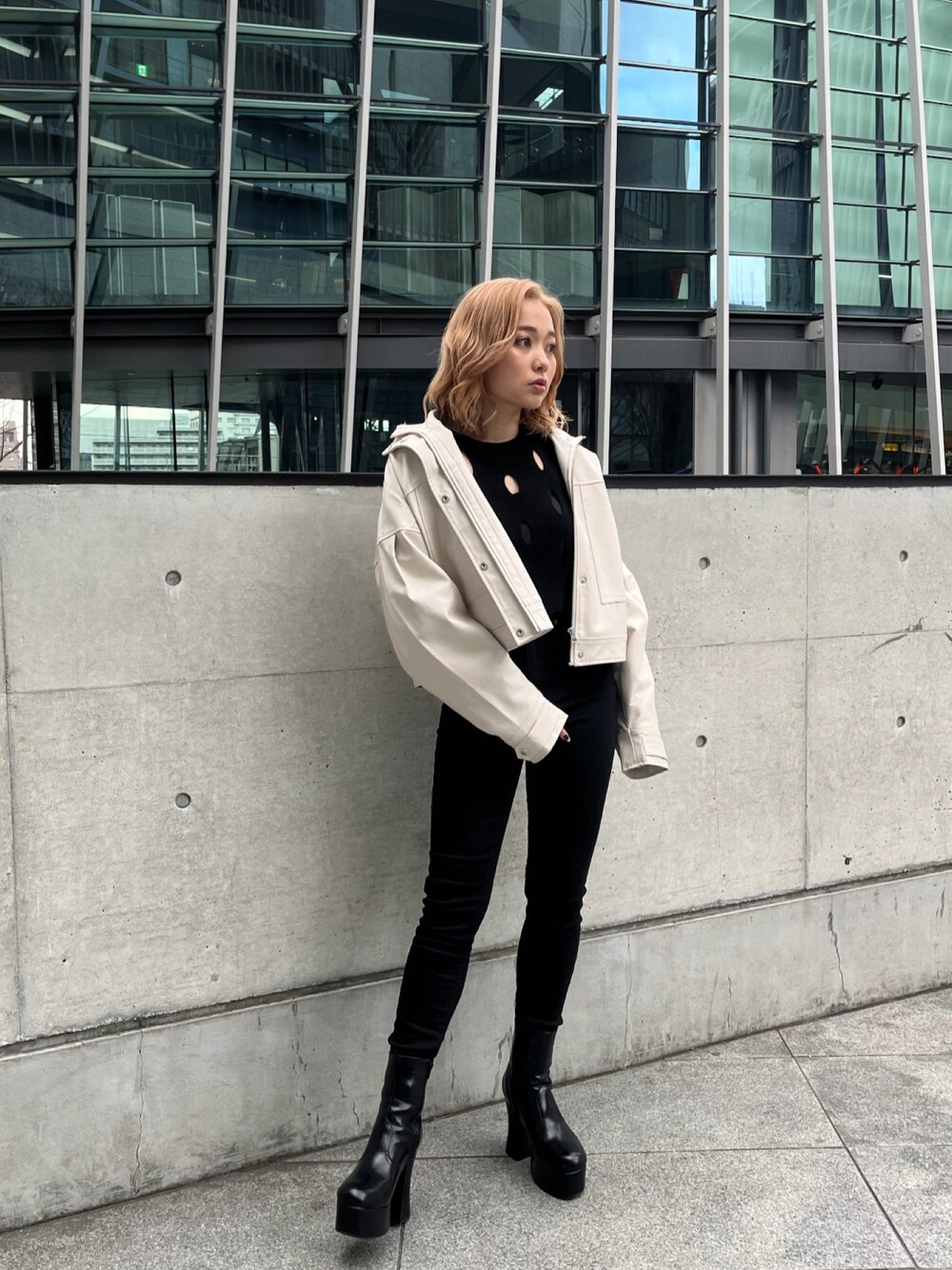 ☆肌見せモノトーンコーデ☆【outer】展示会でも大人気のレザーブルゾン!スタンドカラーがモードでかっこよさをプラスしてくれます‼︎アームホールは広いので動きやすく、中に着込めるので秋冬も着用可能◎156cmで骨盤が隠れるくらいの丈感です。【tops】スラッシュの入ったメッシュニット!クロップド丈なのでハイウエストのボトムスとの相性抜群♡インナーにシャツやタートル、カラーものなど合わせてレイヤードスタイルもおすすめ◎今回はスキニー合わせでかっこよくしてみました!【bottom】着回し抜群のベーシックなスキニーが登場!ストレッチが効いておりフィット感抜群です✴︎156cm/S着用でくるぶし辺りの丈感でブーツインしやすいデザインになってます!!【shoes】トレンド厚底ブーツ!ヒールがしっかりあるのでスタイルUP間違いなし。軽量なので長時間履きやすいです◎24.0cm/甲高く横幅広めの私で37サイズ着用でぴったり。