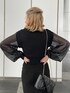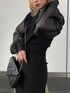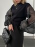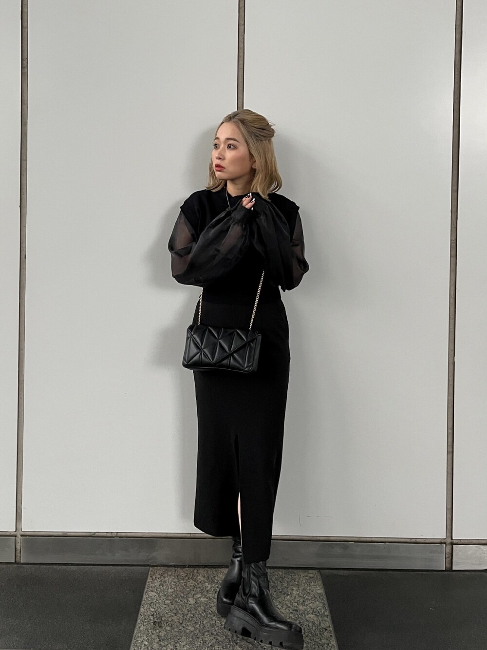 ☆オールブラックで大人かわいいコーデ☆【tops】スリーブ部分に光沢感のあるシアー素材がドッキングされた春らしく女性らしいトップス!全体的にアームはボリューム感あるので透け感があっても二の腕周りを程よくカバーしてくれます◎スリットタイトスカートに厚底ブーツで綺麗目になりすぎないようにしブラックで大人っぽくまとめました!♡