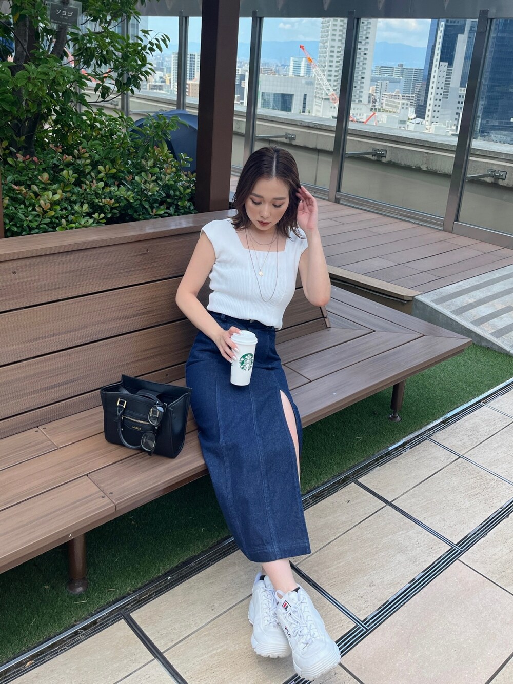 【tops】 毎年大人気のMURUA定番タンクトップ♡柔らかい生地で着心地抜群!程よく肩周りをカバーしてくれるので肌見せ苦手な方でも着やすいです◎ 【skirt】 デニムのスリットスカート♡深めのスリットで女性らしいシルエットに!ロングシーズン着用できるので着回し抜群です◎156cm/S着用。