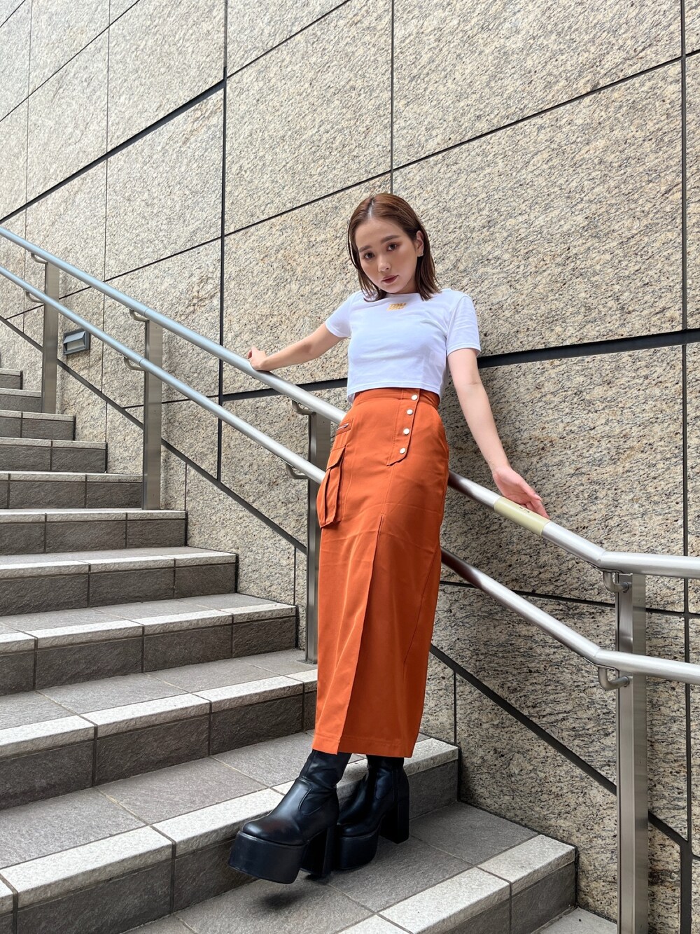 【T-shirt】MURUAロゴTシャツ♡クロップド丈でスタイルアップ間違いなし!ワンポイントのフロントのロゴがコーデのアクセントに◎ 【skirt】 ハイウエストのスリットスカート♡タイトなシルエットと深めのスリットで女性らしい印象に!156cm/S着用。 【shoes】 定番厚底ブーツ♡しっかり厚底なのでスタイルアップ間違いなし!プラットフォームデザインで安定感抜群です。見た目以上に軽いので長時間着用しても疲れにくい◎24.0cm,甲高,幅広の私で37サイズがぴったりです。