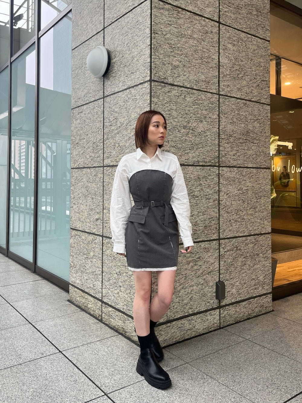 國岡朋実(MURUA)のワンピース「シャツドッキングミニワンピース」を使ったコーディネート