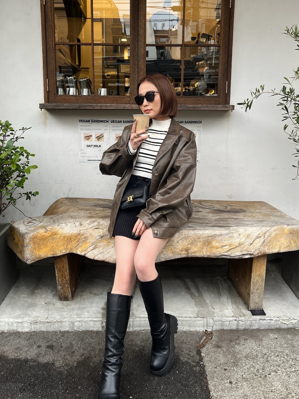【jacket】 コクーンシルエットがポイントのレザージャケット♡ミドル丈なので体型カバーはもちろん保温性もあるのでロングシーズン着用できます!ヴィンテージライクな素材もポイント◎ 【tops】 チラッと肌見せがかわいいニット♡トレンドのクロップド丈でハイウエストのボトムスで合わせてスタイルアップ間違いなし! 【pants】 トレンドのニットパンツ♡柔らかい素材で程よいフィット感で着心地抜群です!156cm/FREE着用。 【shoes】 秋服マストのロングブーツ♡丸みのあるシルエットと程よい厚底でスタイルアップと女性らしい雰囲気に!24.0cm,甲高,幅広の私で37サイズがぴったりです。