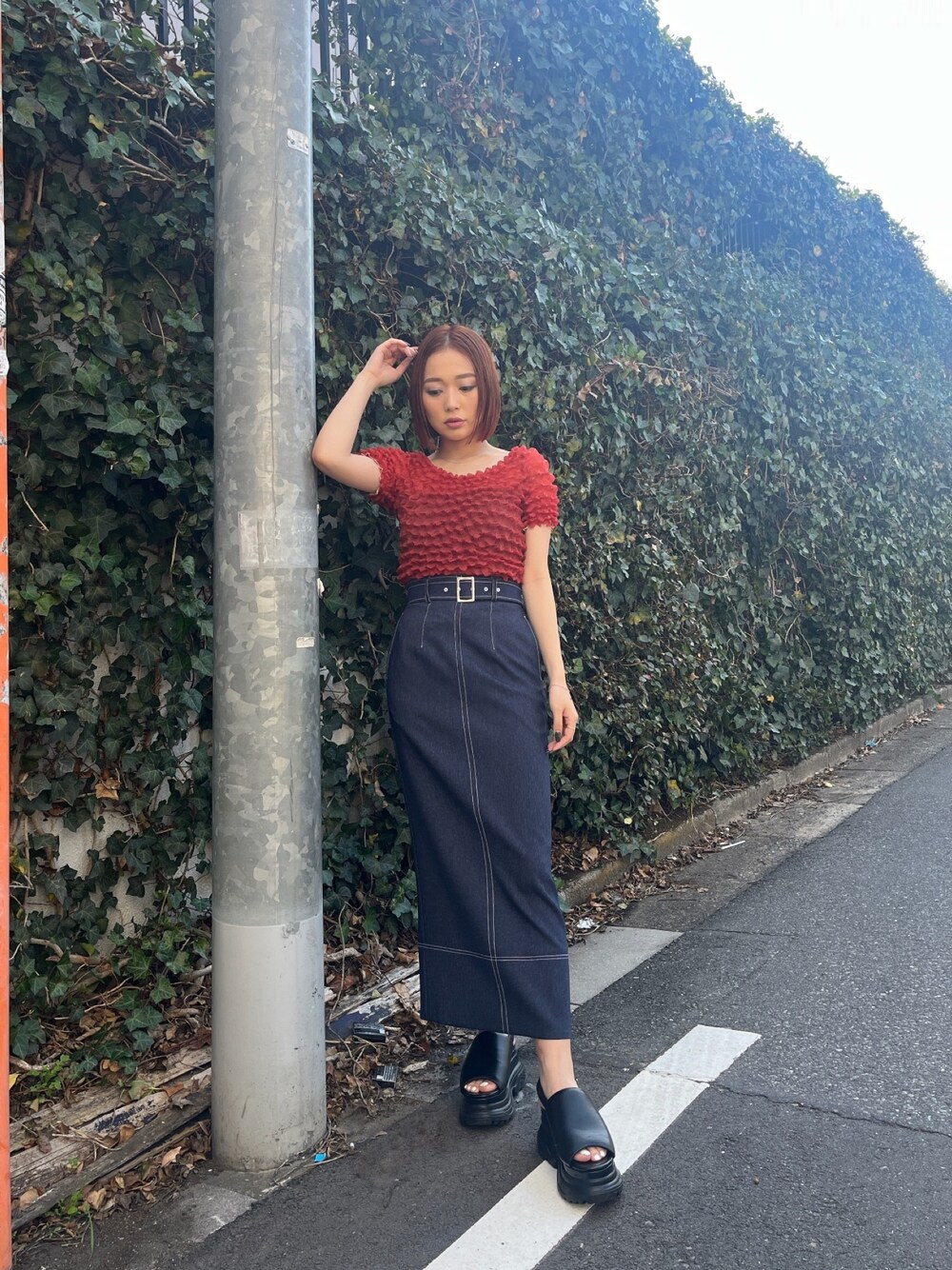 【tops】 デザインが可愛いトップス♡伸縮性抜群なのでオフショルダーにして着用も可能です! 【skirt】 美シルエットのタイトデニムスカート♡ポリエステル100%のデニムライクな素材でややストレッチもあり履き心地も良く色落ちも気にせず着用できます。156cm/S着用。