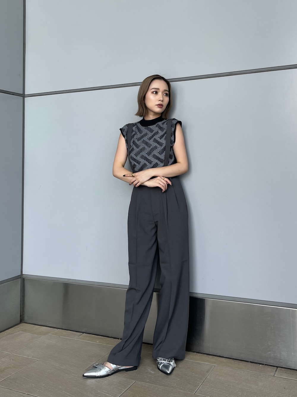 【tops】 毎年人気のジオメトリック柄ニットタンクが今年もバージョンアップして登場♡フレンチスリーブなので肩周りをカバーし華奢見えさせてくれます。1枚で着るのはもちろん、ジャケットなどのインナーとしても使えます◯ 【pants】 美脚が叶うサスペンダーパンツ♡ハイウエストでスタイルアップ効果抜群!サスペンダーは取り外しでき、長さ調整もできます!156cm/S着用。オールシーズン着用可能◎ (タンク×パンツのセット販売もあり。) 【shoes】 お洒落見え間違いなしのパンプス♡ベルトデザインがポイント!高低差1.6cmとヒールが高くないのでフラットで歩きやすいです◎少しサイズ大きめで24.0cm,甲高,幅広の私で23.5cm着用。(24.5cmだと少し大きめでした。)