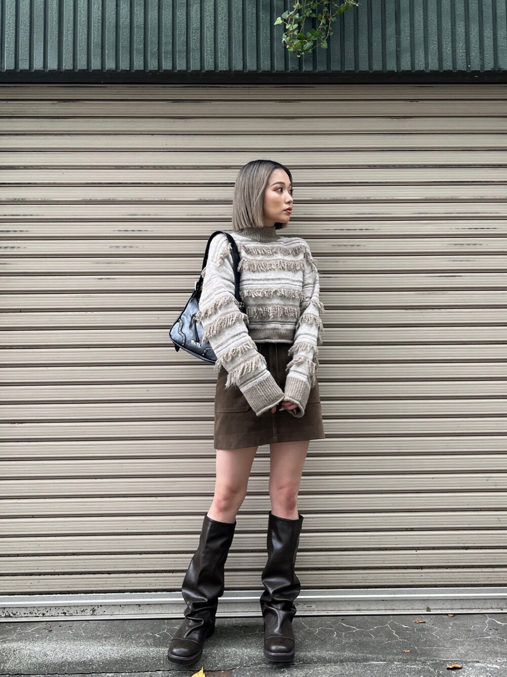 【tops】 フリンジデザインが目を惹くニット♡MURUAらしいデザインと、配色がポイントです!チクチク感も無いので敏感肌の方でも◎ゆるっとしたシルエットなのでボディラインは拾わず丈はinもできるくらいの丈感ですがoutスタイルで着用も可愛いです! 【skirt】 素材、シルエットがおしゃれ見えるすること間違いなしのミニスカート♡インナーショーツ付きなので安心して着用しやすいです!156cm/S。 【shoes】 トレンド感満載のカバーブーツデザインのロングブーツ♡スカートと色味を合わせてブラウンで組み合わせてみました!24.0cm,甲高,幅広の私で24.5cm着用。