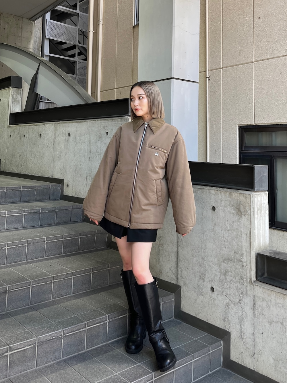 【outer】 中綿入りのデトロイトジャケット♡羽織るだけでおしゃれ見え間違いなし!カジュアル派さんにおすすめです◎異素材の襟がポイント! 【shoes】 トレンドのデザインのロングブーツ♡フラットなので履き心地抜群!スキニーやデニムをブーツインしたスタイリングやソックス合わせもおすすめ◎ 24.0cm,甲高,幅広の私で24.5cm着用。